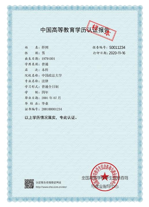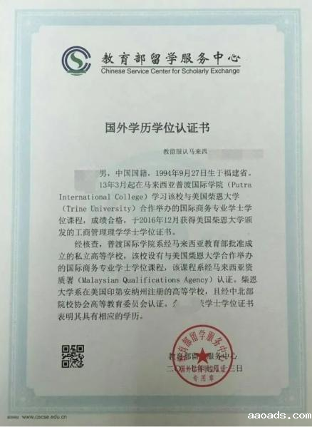 教育部留学服务中心出具的《国(境)外学历学位认证书》 |