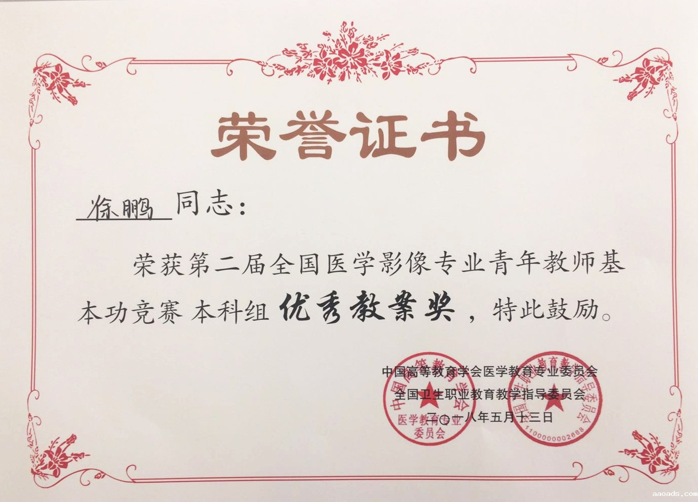 经过激烈角逐,我校医学影像学院影像诊断教研室青年教师徐鹏凭科学严谨的教案设计、形象生动的教具、启发式的互动教学和充满激情的讲解,赢得了专家评委、学生评委及观摩高校教师的一致好评,最终荣获本科组一等奖及优秀教案奖。徐鹏老师在全国大赛的获奖为学校赢得了荣誉,在全国医学影像界充分展示了医学影像学院青年教师扎实的教学功底和先进的教学理念。