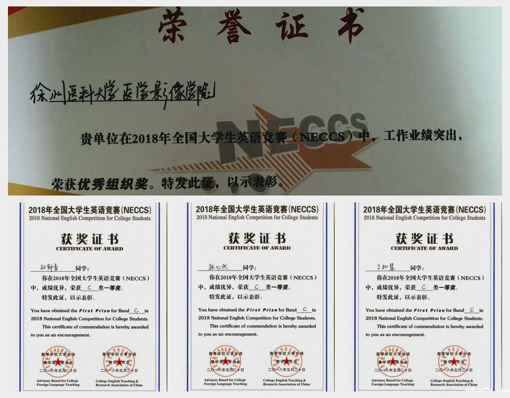 本次竞赛,校领导高度重视,参赛选手积极备赛,5月19日,医学影像学院党委彭波书记带领选手到南京参加比赛,在决赛中,我校学子沉稳作答,勇创佳绩,孙郁青、张心然和丁加慧同学分别获全国大学生英语竞赛一等奖。此外,经过组委会对初赛试卷的认真批阅和严格审查,来自医学影像学院的曹逸等15名同学获得全国大学生英语竞赛二等奖,临床医学系的卫荣远等24名同学获得全国大学英语竞赛三等奖。同时,在初赛阶段,我校组织有序,荣获“优秀组织奖”。