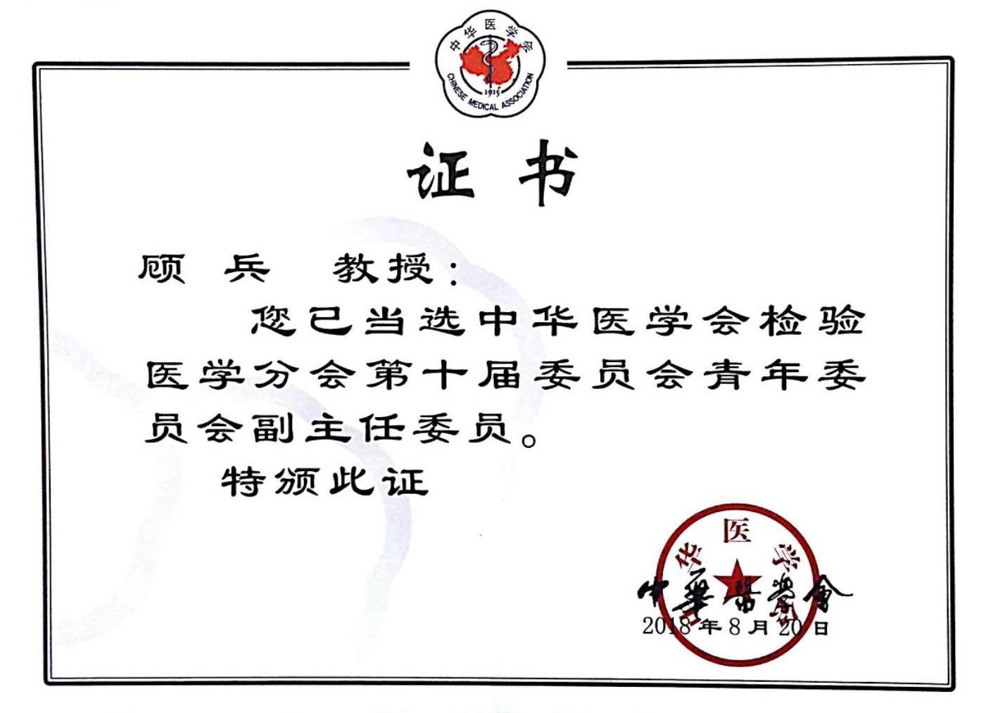 我校顾兵副教授当选中华医学会检验医学分会第十届青年委员会副主任委员