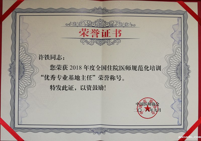 许铁教授获得2018年度“优秀专业基地主任”称号,不仅是对近年来急诊科在住院医师规范化培训基地建设成就上的表彰,也是对我校住院医师规范化培训工作日益精进的肯定。在接下来的住院医师规范化培训工作过程中,我校将会以质量控制、精细管理、提升胜任力为中心,形成具有本校特色的教学管理模式,进一步提升我校住院医师规范化培训质量,扩大我校住院医师规范化培训工作影响力。