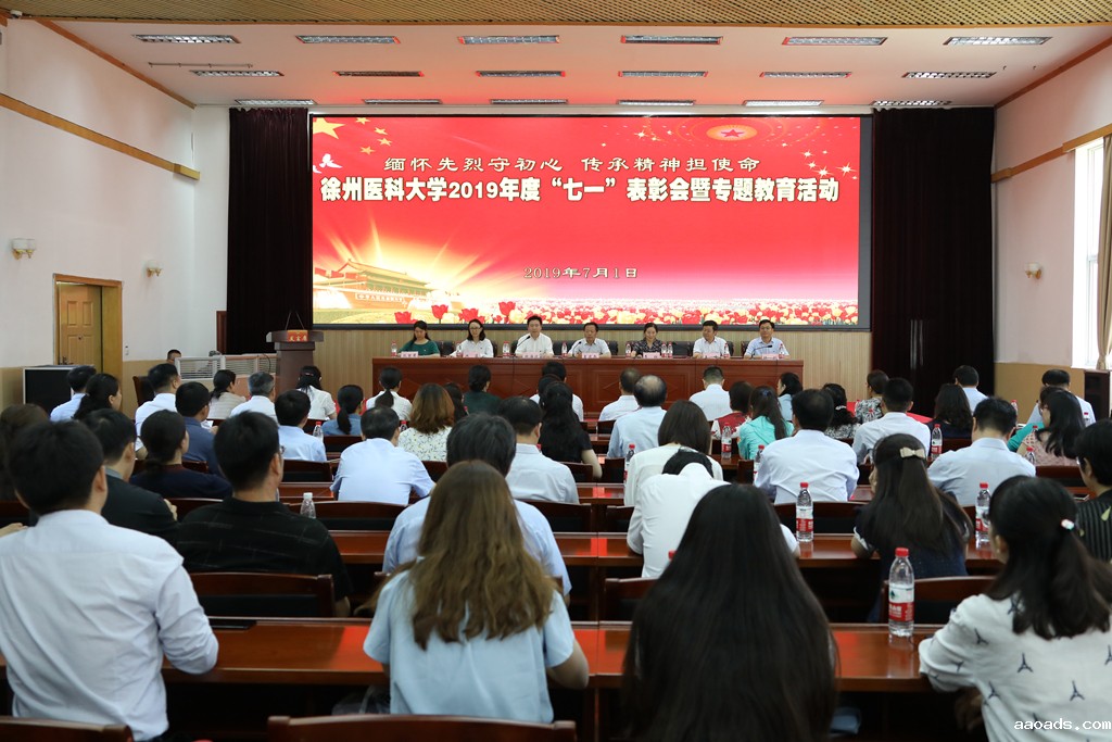 徐海波副书记宣读表彰文件,对2018—2019学年度省、市和校级先进基层党组织、优秀共产党员和党务工作者进行表彰。徐医附院党委获评省高校先进基层党组织,医学信息与工程学院党总支获省高校党建创新奖三等奖,徐医附院党委二总支四支部、医学影像学院主校区学生党支部获省高校最佳党日活动优胜奖,基础医学院党委获评市先进基层党组织,另有三位同志分获省、市优秀共产党员称号。学校还评选出了15个先进基层党组织、9名优秀党务工作者和56名优秀共产党员。