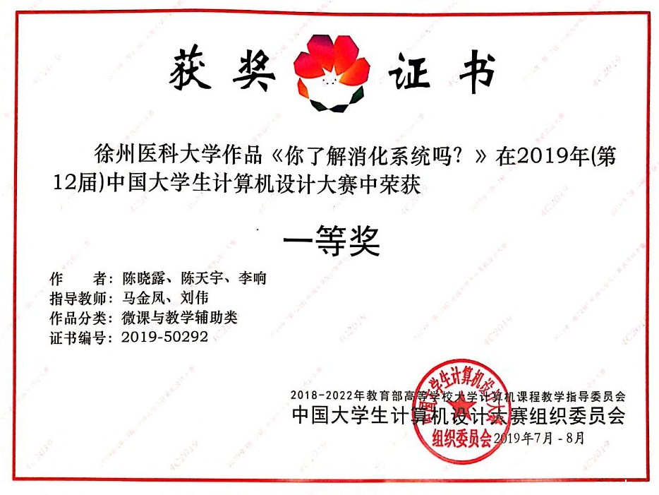 7月22日至26日,第12届中国大学生计算机设计大赛在北京大学举行。由我校医学信息与工程学院马金凤、刘伟老师指导,2017级药学院陈晓露、生命科学学院陈天宇、李响同学创作完成的作品《你了解消化系统吗?》,在微课与教学辅助类全国总决赛中荣获一等奖。