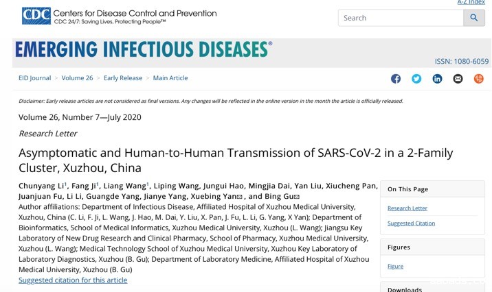 3月31日,感染病领域国际权威杂志《EMERGING INFECTIOUS DISEASES》在线发表了徐医附院感染性疾病科颜学兵教授团队、医学技术学院顾兵教授团队及医学信息学院王亮副教授合作的关于新冠肺炎最新研究成果(https://wwwnc.cdc.gov/eid/article/26/7/20-0718_article)。徐医附院感染性疾病科李春杨、季芳博士,医学信息学院王亮副教授为本文共同第一作者,顾兵教授和颜学兵教授为文章通讯作者。