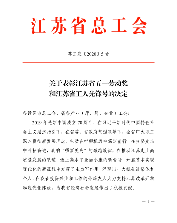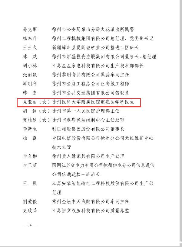 日前,江苏省总工会印发《关于表彰江苏省五一劳动奖和江苏省工人先锋号的决定》(苏工发〔2020〕5 号),表彰了一批先进集体和个人,授予全省148个单位江苏省五一劳动奖状, 263 名同志江苏省五一劳动奖章,我校附属医院获“江苏省五一劳动奖状”、附属医院重症医学科晁亚丽同志获“江苏省五一劳动奖章”荣誉称号。