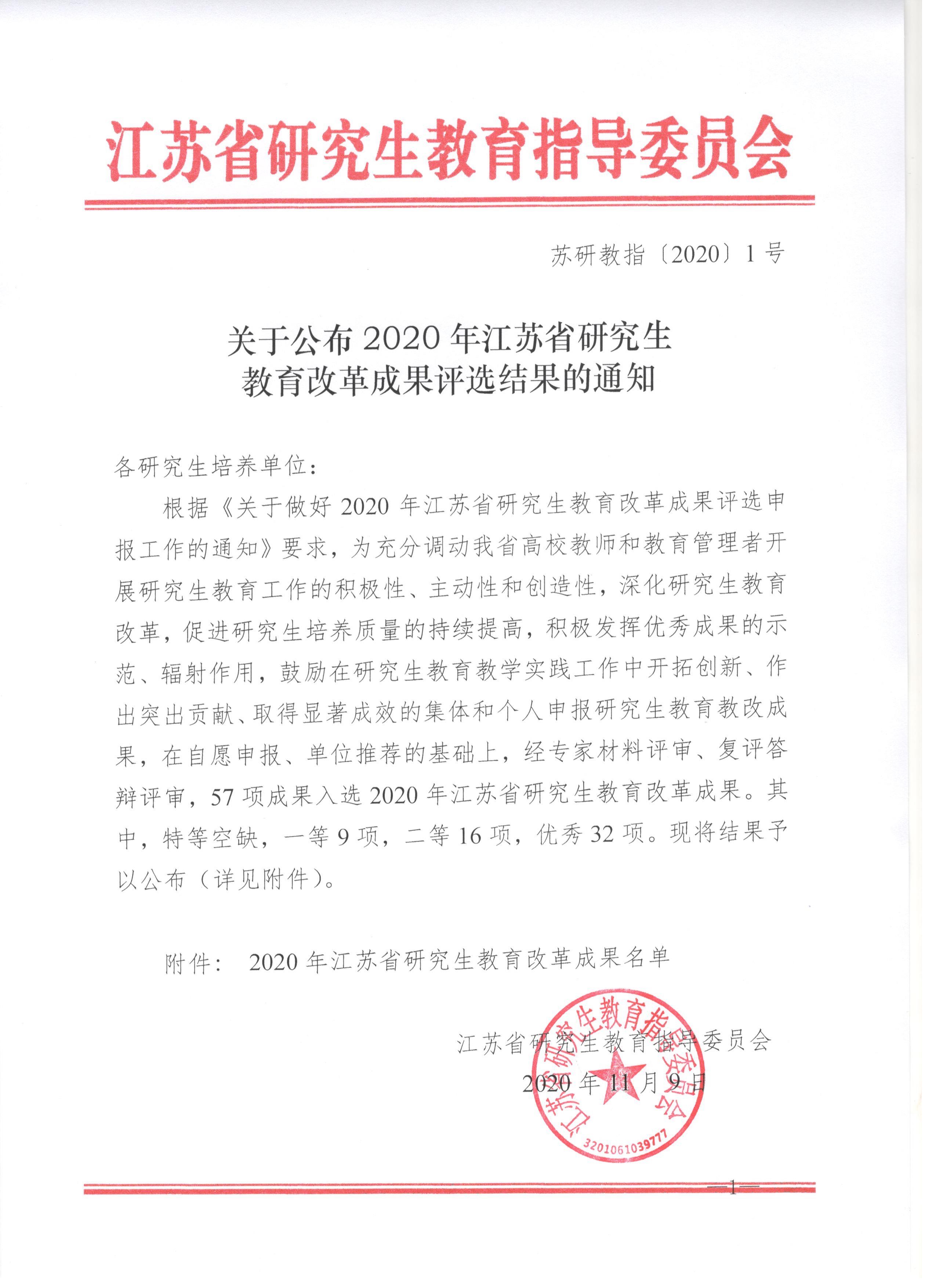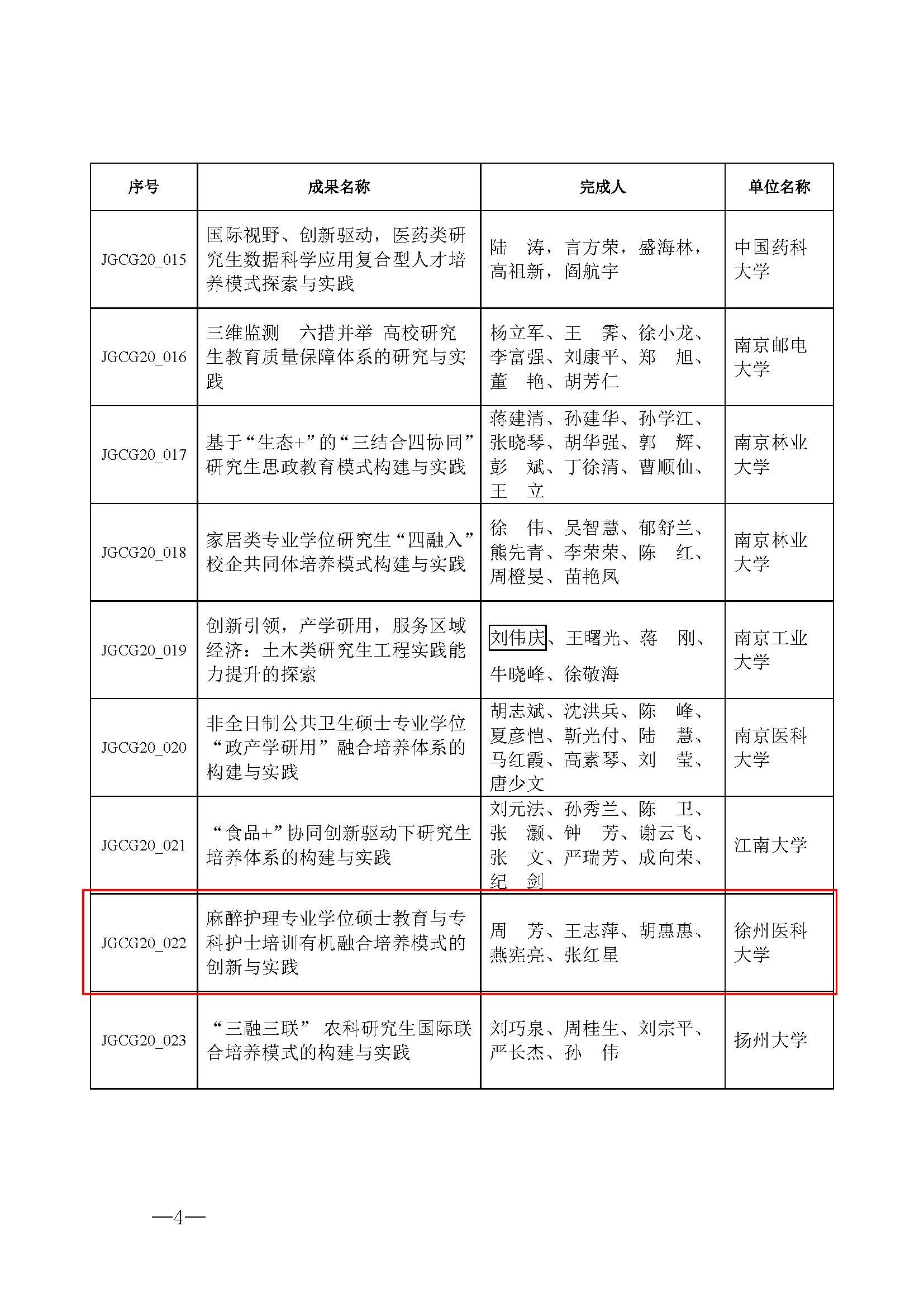 近日,江苏省研究生教育指导委员会下发《关于公布2020年江苏省研究生教育改革成果评选结果的通知》,经专家材料评审、复评答辩等多重环节,我校周芳教授团队申报的《麻醉护理专业学位硕士教育与专科护士培训有机融合培养模式的创新与实践》项目荣获二等奖,印晓星教授团队申报的《以药学服务为核心的药学专业学位研究生“3双”培养模式的构建与实践》项目荣获优秀奖。