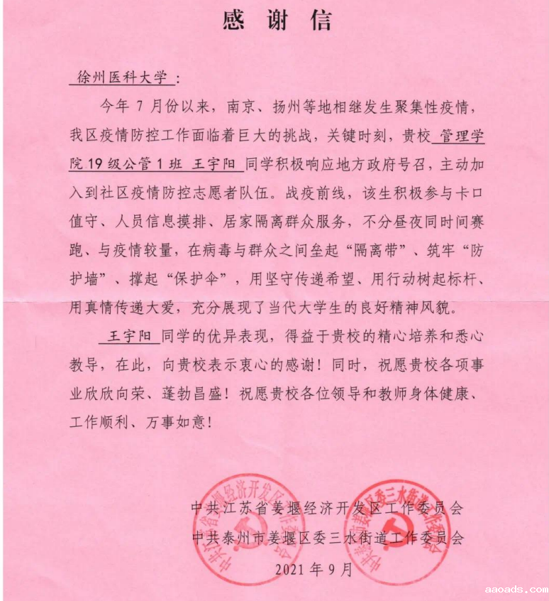 暑假期间,我校147名师生组成的防疫青年志愿者团队,支援徐州经济技术开发区全员核酸检测应急演练,社区百姓纷纷为他们竖起大拇指还专门制作了短视频。护理学院2019级学生祁遇一家三口抗疫的事迹在中央电视台《新闻直播间》中播出。第一临床医学院2021届毕业生周凎和家人并肩作战、守护抗疫、基层立业的事迹被《江南晚报》报道。截止目前,我校已收到各地发来的感谢信、表扬信22封,授予荣誉证书的师生达162人。