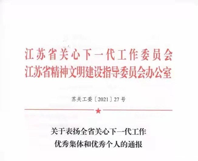 近日,江苏省关心下一代工作委员会、江苏省精神文明建设指导委员会办公室联合下发《关于表扬全省关心下一代工作优秀集体和优秀个人的通报》,江苏省教育系统关心下一代工作委员会下发《关于表彰全省教育系统关心下一代工作先进集体和先进个人的决定》,我校关工委喜获多项省级表彰。学校关工委荣获“江苏省教育系统关心下一代工作先进集体”荣誉称号,王勇同志荣获“江苏省关心下一代工作先进个人”荣誉称号,朱元业同志荣获“江苏省教育系统关心下一代工作先进个人”荣誉称号。