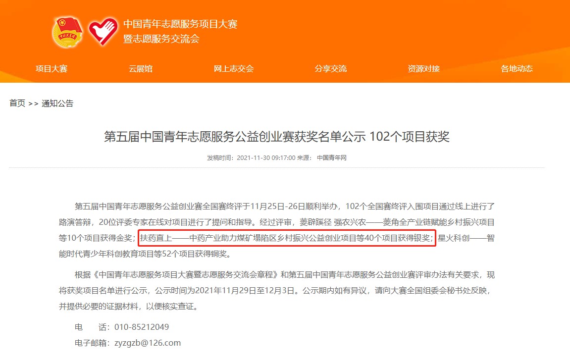近日,由共青团中央等九家单位共同举办的第五届中国青年志愿服务公益创业赛落下帷幕,入围全国总决赛的102个项目团队经过激烈的路演答辩,决出了金奖10个,银奖40个,铜奖52个。我校青年志愿服务品牌项目“扶药直上——中药产业助力塌陷区乡村振兴”荣获国赛银奖。