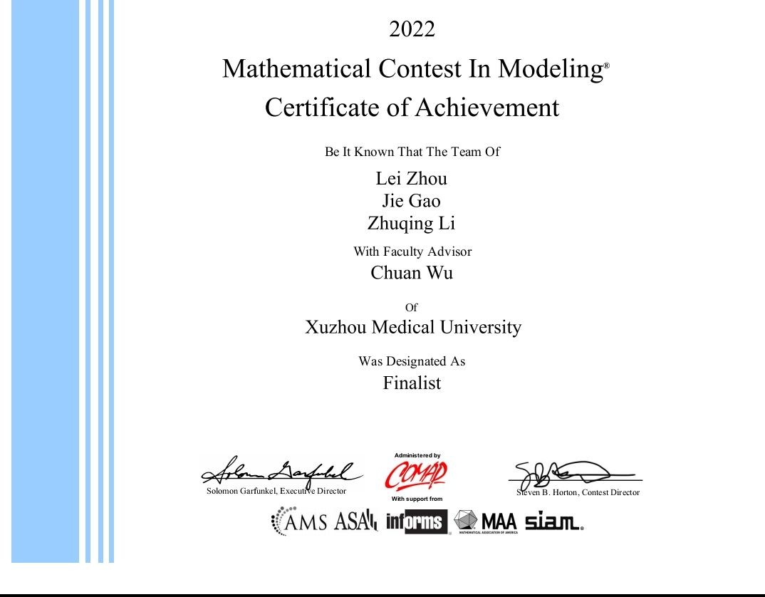 近日,2022年美国大学生数学建模竞赛(MCM/ICM)获奖名单揭晓,我校医学信息与工程学院吴川老师指导,计算机科学与技术专业周磊、医学信息工程专业高杰等同学组成的代表队,克服疫情影响,全力拼搏,从来自中国、美国、加拿大、英国、澳大利亚等22个国家的2万7千多支队伍中脱颖而出,最终获得特等奖提名奖(Finalist),取得我校在该项赛事上新的突破。