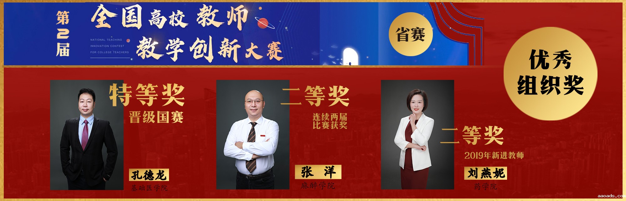 5月14日至16日,第二届江苏省高校教师教学创新大赛(本科)暨第二届全国高校教师教学创新大赛选拔赛决赛举办,我校三位教师晋级决赛且均斩获奖项。基础医学院孔德龙老师首次参赛,获得地方赛道副高组特等奖并成功晋级国赛;麻醉学院张洋老师获得地方赛道正高组二等奖,且是我校连续两届获奖选手;药学院2019年进校教师刘燕妮获得地方赛道中级组二等奖;我校荣获“优秀组织奖”,创造了学校在该项赛事成绩的历史性突破。