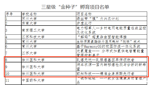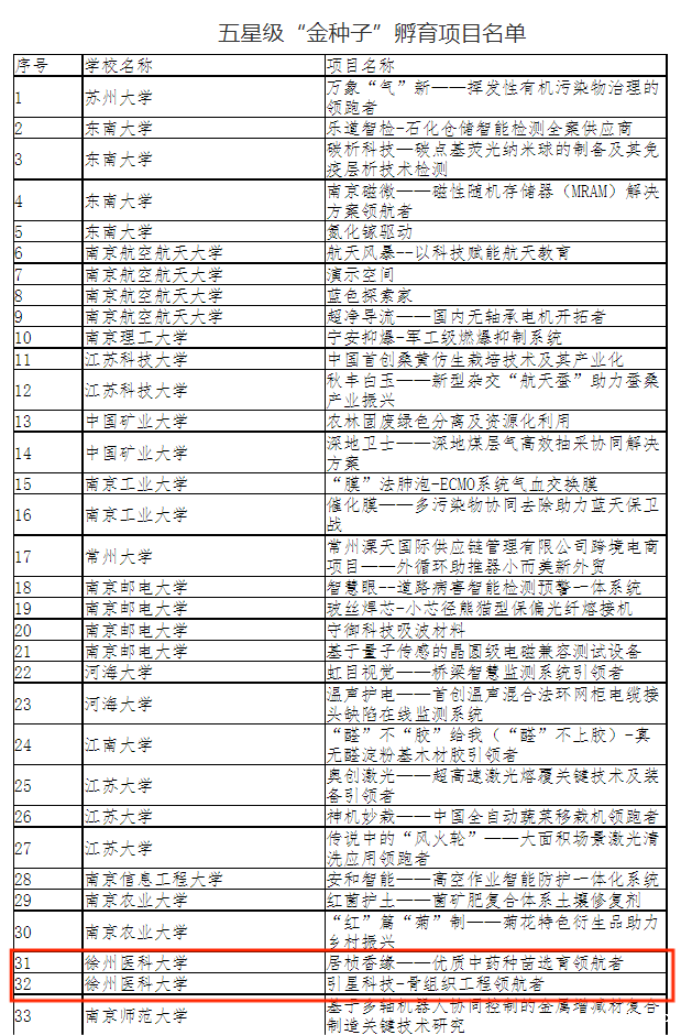 7月1日,江苏省教育厅“金种子”孵育项目路演评选结果公布,我校5个项目成功入选“金种子”孵育星级项目,其中“居桢香缘——优质中药种苗选育领航者”“引星科技——骨组织工程领航者”2个项目入选“五星级项目”,“前知科技——精准全身麻醉先行者”“溯本求源——国内转移癌检测与诊断的新希望”“乳癌无忧——乳腺癌早筛的领航者”3个项目入选“三星级项目”。