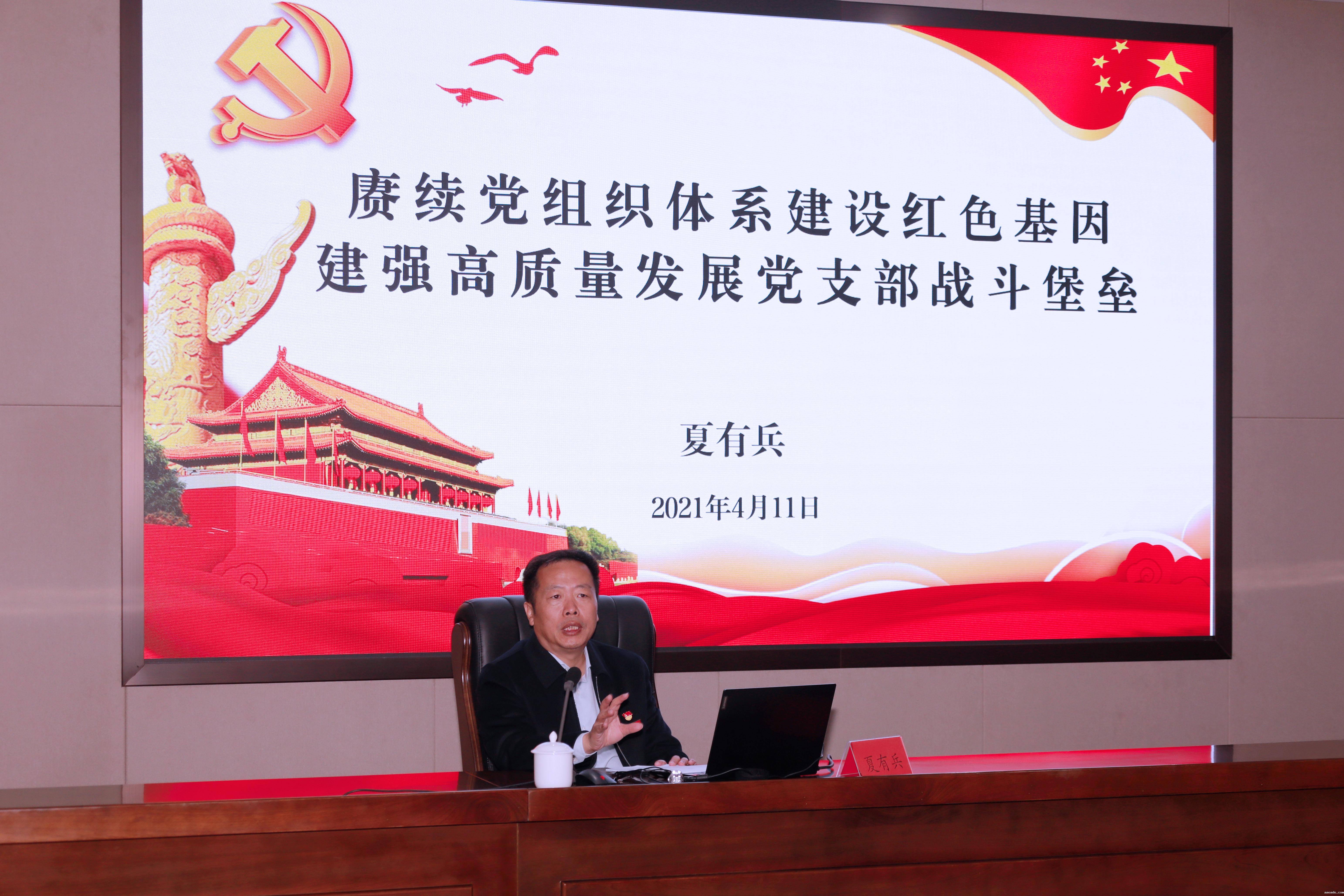 书记领学环节,夏有兵书记以《赓续党组织体系建设红色基因,建强高质量发展党支部战斗堡垒》为题,通过我国第一个共产党组织、江苏第一个中共党支部和“三湾改编”三个党史故事,分享了对党组织建设的认识,阐述了历史给予我们的启示,介绍了我校建校初期党支部情况,解读了十九大以来对党的基层组织建设新要求,分析了我校党支部建设情况,既肯定了支部建设取得的成绩,同时也指出了存在的问题。