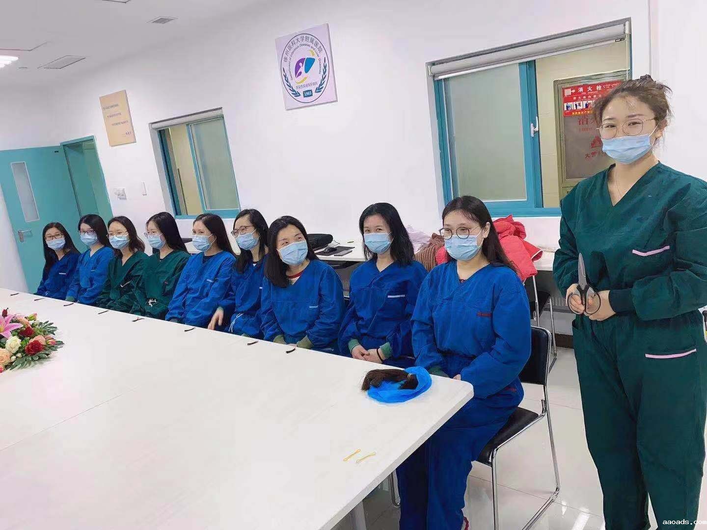 1月29日,徐医附院传染病科(感染性疾病科)nCoV救治组工作群中出现几张特殊的集体照,照片中的女护士们身着工作服,拿着减掉的头发,面对镜头露出自信的笑容。她们誓言断发明志,共抗毒魔。