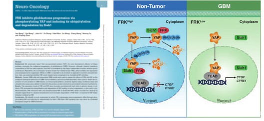 近日,我校神经系统疾病研究所在脑胶质瘤的分子机制与靶向治疗方面取得重要进展,相关研究成果以 “FRK inhibits glioblastoma progression via phosphorylating YAP and inducing its ubiquitylation and degradation by Siah1” 为题,在美国、日本和欧洲神经肿瘤学学会的官方期刊Neuro-Oncology(中科院1区,Top期刊)在线发表。