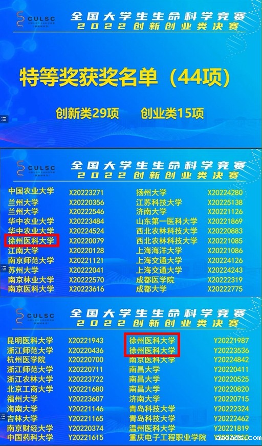 凭借着各团队的优异表现,药学院《居桢香缘——优质中药种苗选育领航者》(指导教师:张春平、袁子桐)、麻醉学院《靶向TRPML1通道抑制自噬治疗肿瘤的作用及分子机制研究》(指导教师:王午阳、邢燕红)、第一临床医学院《引星科技——骨组织工程引航者》(指导教师:陈宏亮、孙森)3个项目荣获国赛特等奖;第二临床医学院《急先锋——公共化心肺复苏辅助装置的首创者》(指导教师:燕宪亮、张颖)、影像学院《环影医疗——脑胶质瘤智能诊断开拓者》(指导教师:巩萍、陈洁)等10个项目荣获国赛一等奖;生命科学学院《愈可肤——手消产品低醇化领域的先行者》(指导教师:刘毅、朱慕春)等8个项目荣获国赛二等奖;医学信息与工程学院《屏踪“质”影——胶质瘤基因突变智能诊断系统》(指导教师:朱红、唐璐)等9个项目荣获国赛三等奖。