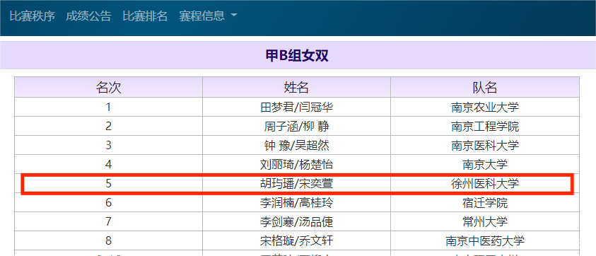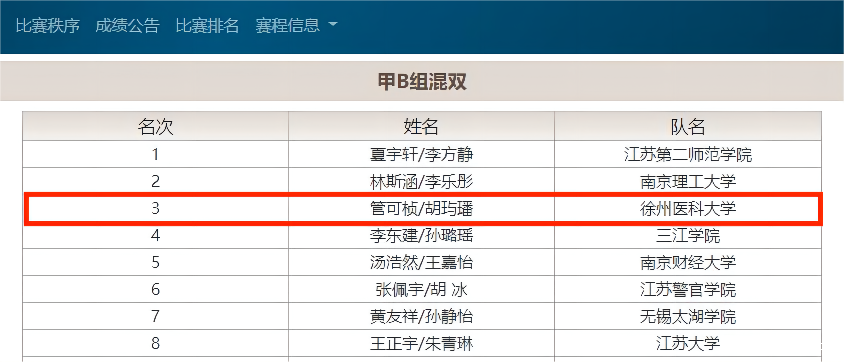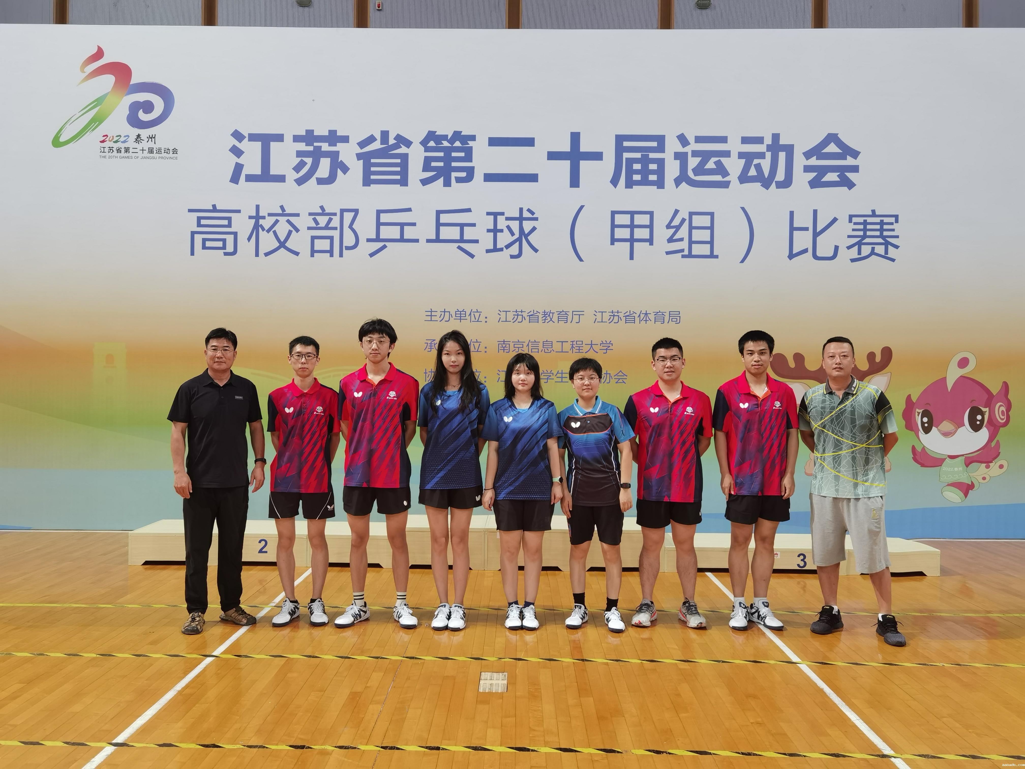 8月12日-16日,由江苏省教育厅、江苏省体育局主办的江苏省第二十届运动会高校部乒乓球(甲组)比赛在南京信息工程大学举行。我校代表队由领队兼教练程佳鹏、教练张朝法以及学生运动员7人组成,经过5天的激烈角逐,我校运动健儿管可桢(医学影像学院)、胡玙璠(第一临床医学院)荣获甲B组混合双打季军,胡玙璠(第一临床医学院)、宋奕萱(第一临床医学院)荣获甲B组女子双打第5名。