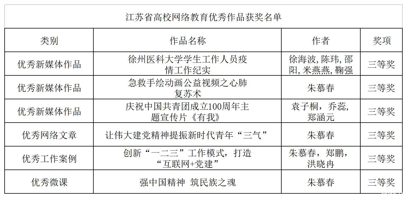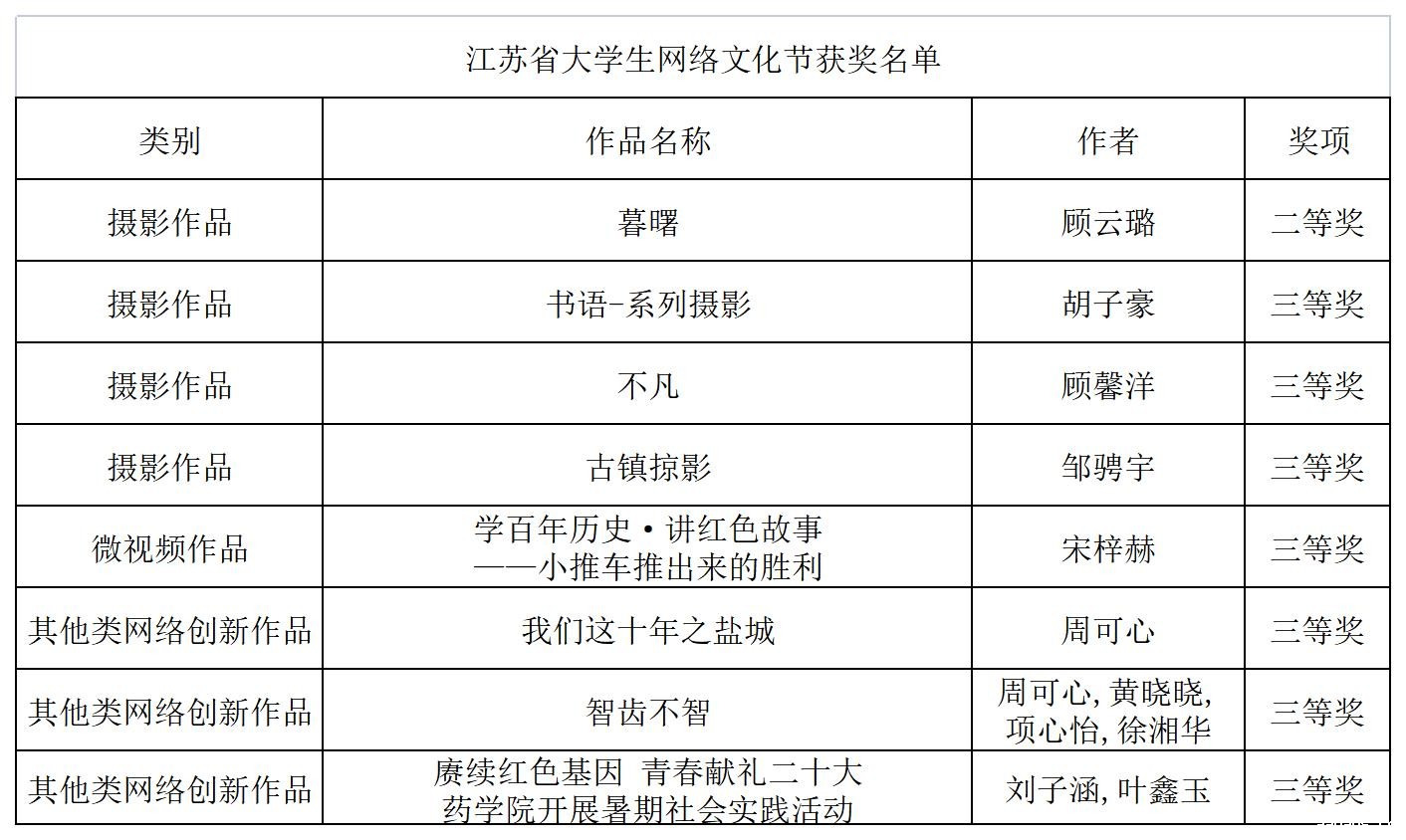 近日,江苏省委教育工委、江苏省教育厅公布了第二届江苏省大学生网络文化节和高校网络教育优秀作品推选展示活动结果,我校喜获大学生网络文化节二等奖1项、三等奖7项,高校网络教育优秀作品三等奖6项。