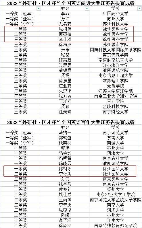 近日,2022年“外研社·国才杯”全国英语写作、阅读大赛江苏赛区省级决赛落下帷幕,我校6名参赛选手在与来自全省各高校公共英语和英语专业的近600名选手的激烈角逐中,取得优异成绩。在写作赛中,第一临床医学院的陈柯冰同学凭借扎实的语言功底及缜密的逻辑思维荣获一等奖;医学技术学院的李依妮同学获得二等奖。在阅读赛中,第一临床医学院的沈柯佳同学从200多名决赛选手中脱颖而出,获得一等奖;麻醉学院的顾容榕同学和第一临床医学院的李佳凝同学分获二、三等奖。