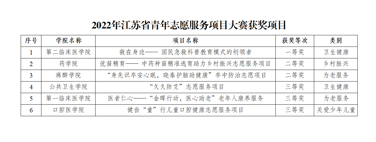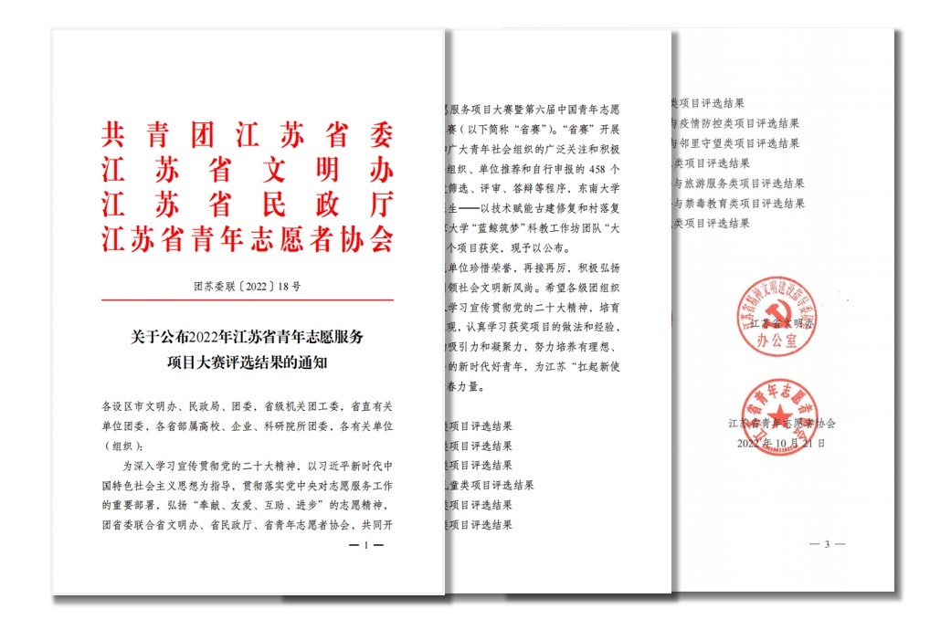 为深入学习宣传贯彻党的二十大精神,以习近平新时代中国特色社会主义思想为指导,贯彻落实党中央对志愿服务工作的重要部署,弘扬“奉献、友爱、互助、进步”的志愿精神,团省委联合省文明办、省民政厅、省青年志愿者协会,共同开展2022年江苏省青年志愿服务项目大赛暨第六届中国青年志愿服务项目大赛江苏省选拔赛。我校推报的6项作品全部获奖,其中一等奖1项、二等奖2项、三等奖3项。
