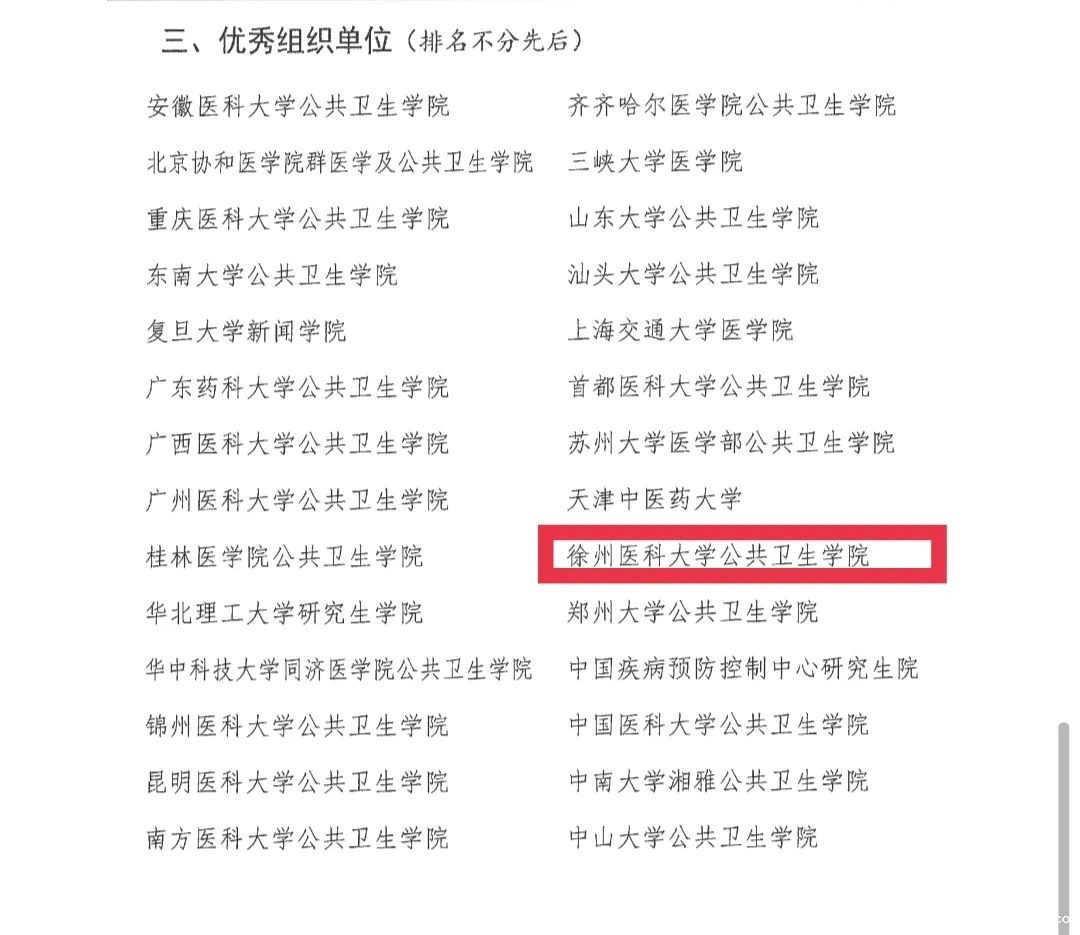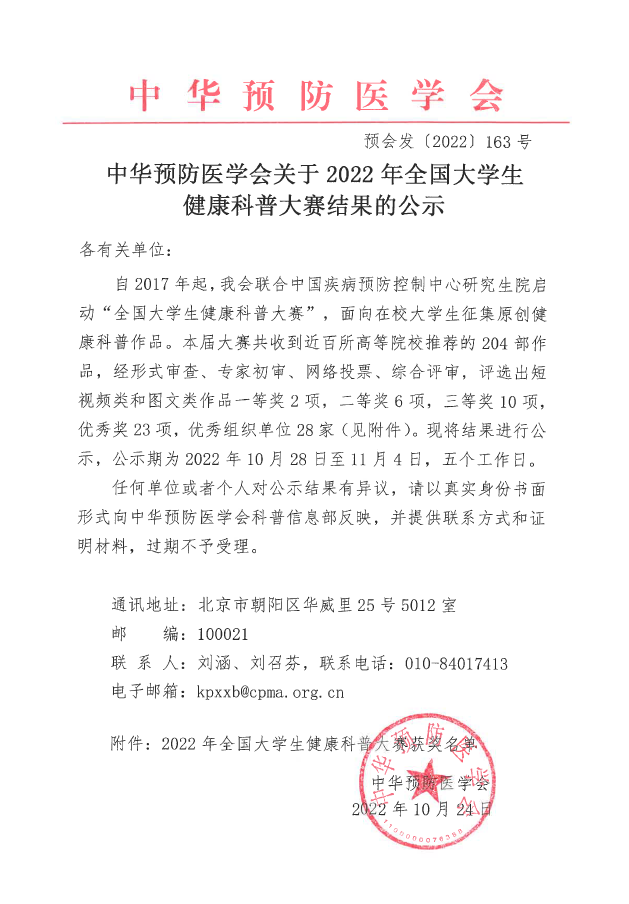 近日,中华预防医学会公示了2022年(第六届)全国大学生健康科普大赛结果,我校公共卫生学院获“优秀组织单位”荣誉称号。