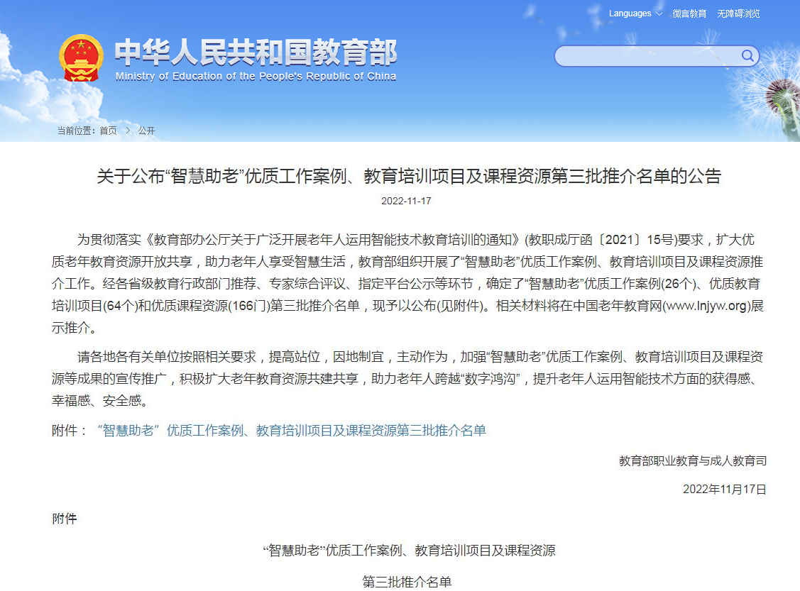 随着我国经济社会发展进入“数字化”、“智能化”时代,老年群体出行难、就医难、购物难等问题日渐突出,为帮助老年人更好地适应并融入信息化社会,助力老年人跨越“数字鸿沟”,教育部组织开展了全国“智慧助老”优质工作案例、教育培训项目及课程资源评选工作。我校继续教育学院紧扣“智慧助老”主题,结合现有养老护理培训项目平台,充分利用学校专业优势开发“智慧助老”课程教学资源,积极组织和发动教师参与社区教育,最终入选国家“智慧助老”优质课程资源推介名单。