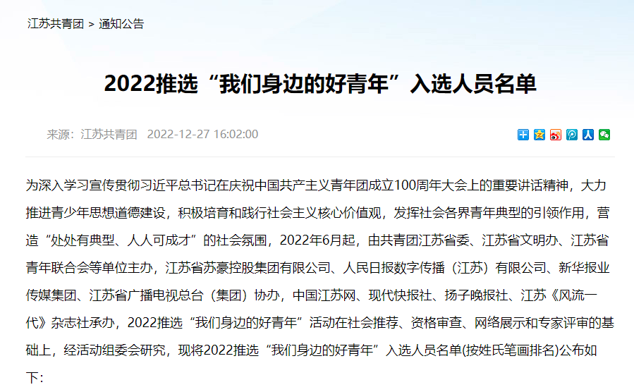 近日,2022年江苏省“我们身边的好青年”入选人员名单揭晓,社会各界共100名好青年入选,涵盖疫情防控、爱岗敬业、创新创业、勤学上进、崇德守信、乡村振兴六个类别。