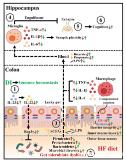 衣康酸是三羧酸循环的中间代谢产物,近年来免疫代谢学领域的明星分子。研究证实,该代谢物是负向调控巨噬细胞炎症反应的“开关”之一,其抗炎机制及在疾病中的应用潜力受到广泛关注。但目前关于衣康酸能否改善神经退行性疾病以及作用机制,鲜有报道。该论文报道了衣康酸二甲酯(一种能够透过细胞膜的衣康酸衍生物)可下调神经炎症、减轻突触超微结构损伤,进而改善肥胖相关认知障碍。进一步研究发现,衣康酸二甲酯可减轻肥胖小鼠的肠道菌群紊乱和肠屏障损伤,与丁酸产生菌丰度增加有关。此外,菌群移植实验证实,衣康酸二甲酯对认知障碍的保护作用与肠道菌群关系密切。基于上述结果,该论文在国际上首次提出“衣康酸二甲酯可通过纠正菌群-肠-脑轴紊乱改善肥胖相关认知障碍”,为防治肥胖相关神经退行性疾病提供了潜在的药物分子。