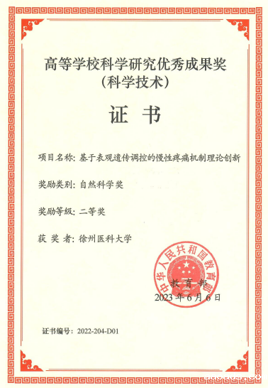 近日,教育部高等学校科学研究优秀成果奖获奖结果公布并颁发证书,我校麻醉学院曹君利教授团队“基于表观遗传调控的慢性疼痛机制理论创新”项目荣获自然科学二等奖(获奖人:曹君利、潘志强、周成华、印晓星、张铭、薛洲亚、朱丽娇、李国芳、郝凌云)。该研究成果奖由麻醉学院和药学院联合申报。