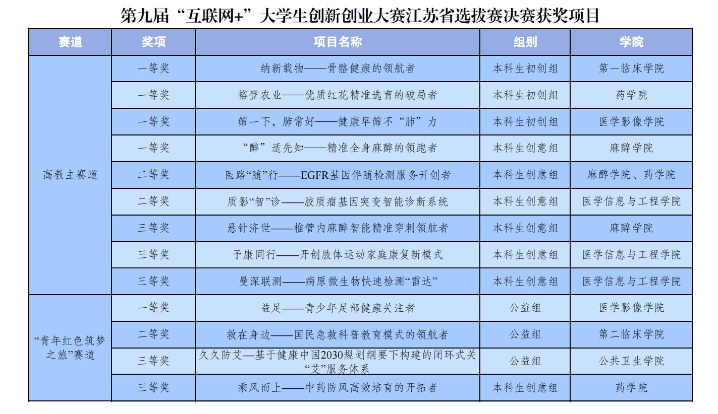 江苏省“互联网+”大学生创新创业大赛是全省影响力最大的双创盛会,是“三位一体”统筹推进教育、科技、人才工作,推进职普融通、产教融合、科教融汇的生动实践,是深化高校创新创业教育改革、促进高校学生全面发展的重要平台。近年来,我校立足学生创新创业成长需求,不断完善双创教育教学体系,加强专创融合人才培养,积极引导广大徐医青年投入科学创新实践,为科创育人助力,为科创成果添彩。