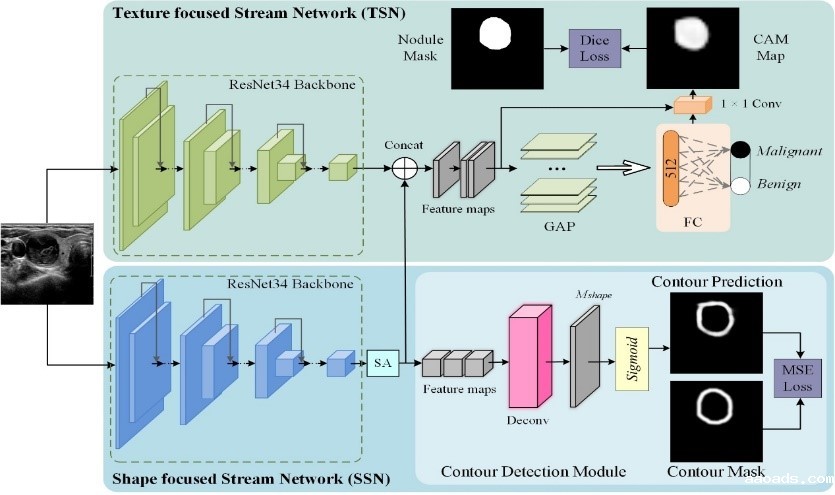 近日,医学影像学院医学影像学实验室在超声甲状腺结节AI诊断研究方面取得了重要进展,相关研究成果以“TS-DSANN: Texture and Shape focused Dual-Stream Attention Neural Network for Benign-Malignant Diagnosis of Thyroid Nodules in Ultrasound Images”为题,发表在人工智能医学图像分析领域的顶级期刊《Medical Image Analysis》上(中科院一区,Top期刊)。该论文第一单位为伟德客户端下载安装手机版,唐璐副教授为第一作者,徐凯教授和上海科技大学沈定刚教授为共同通讯作者,本研究得到国家自然科学基金项目资助。