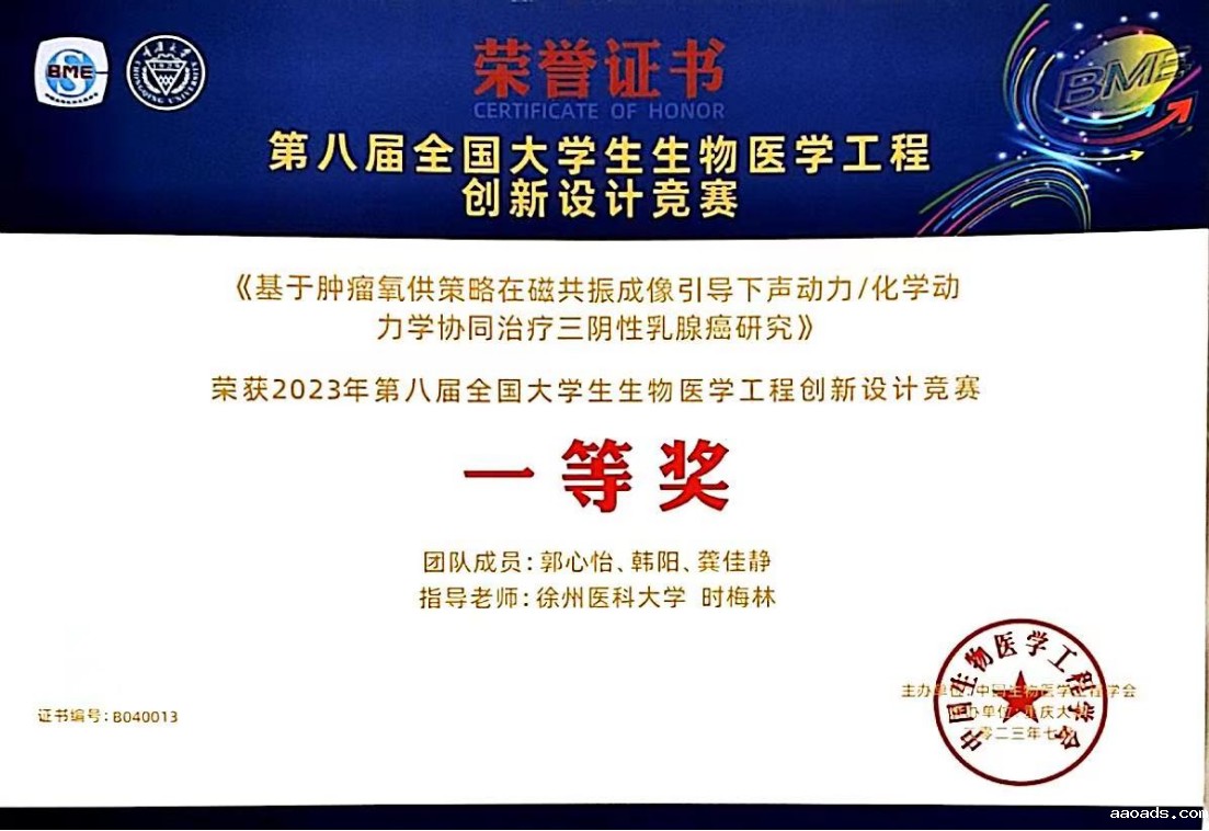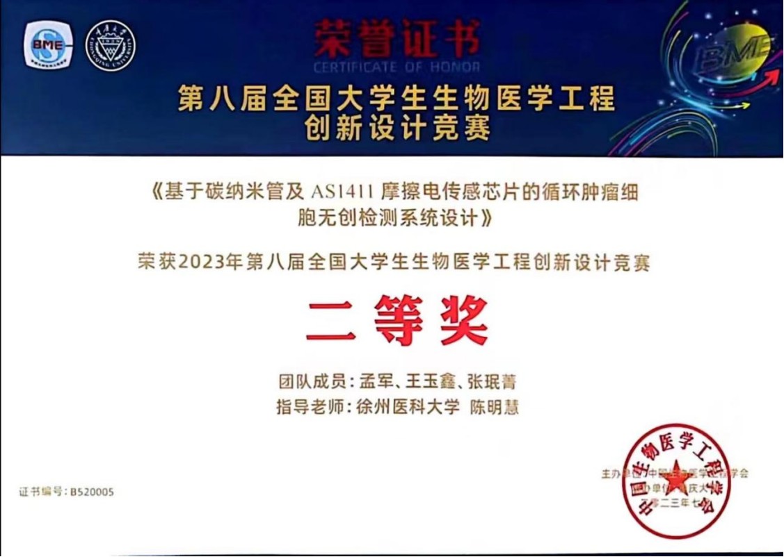 在决赛现场赛中,我校参赛作品“基于肿瘤氧供策略在磁共振成像引导下声动力/化学动力学协同治疗三阴性乳腺癌研究”(指导老师:时梅林)获得国赛一等奖;“基于碳纳米管及AS1411摩擦电传感芯片的循环肿瘤细胞无创检测系统设计”(指导老师:陈明慧)、“前庭平衡系统生物力学机制的研究及其在运动病诊断中的应用”(指导老师:吴翔)2个项目获得国赛二等奖。
