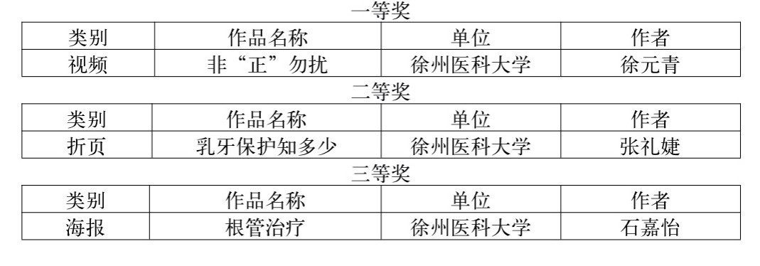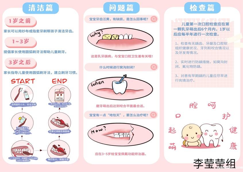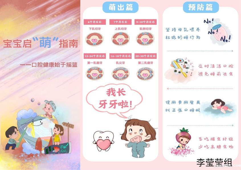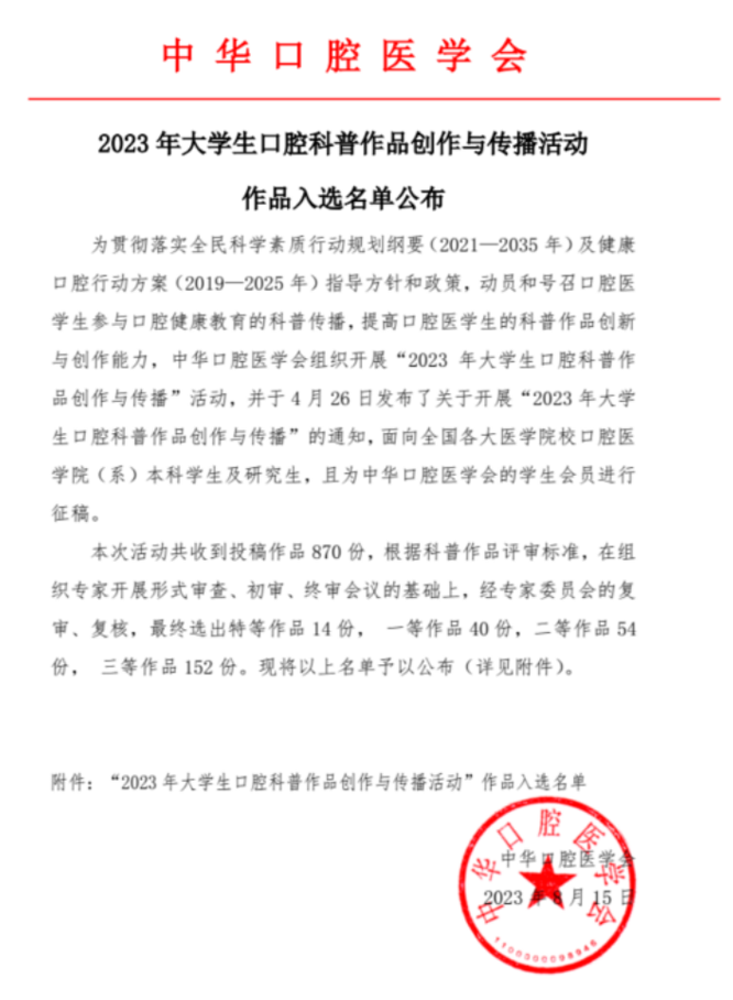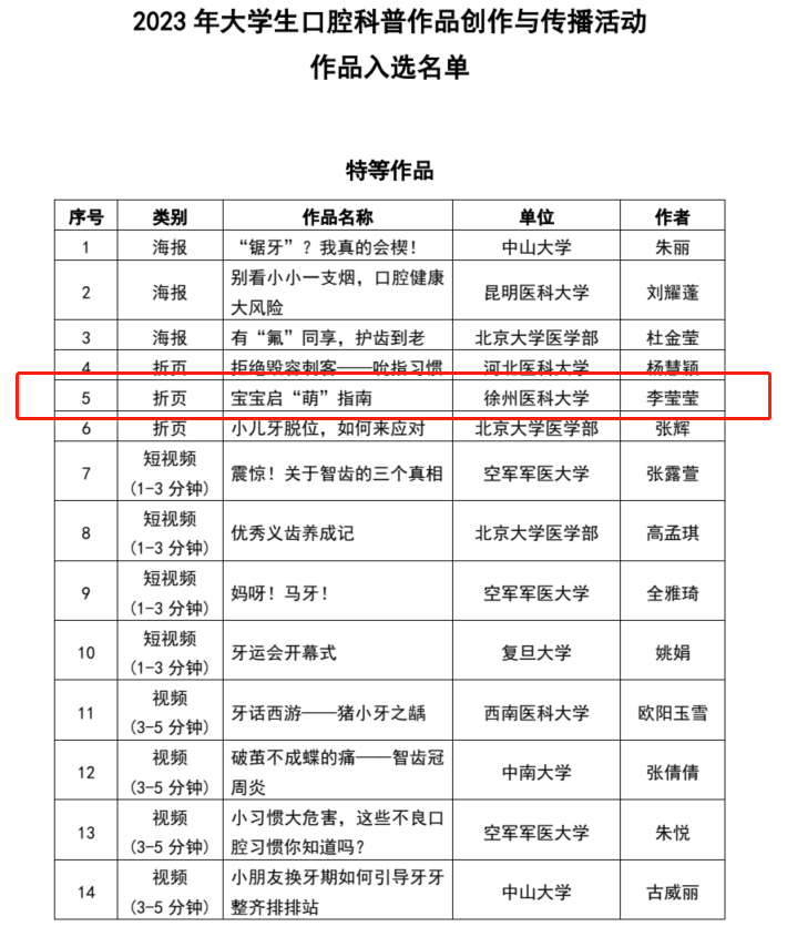 近日,中华口腔医学会公布2023年大学生口腔科普作品创作与传播活动作品入选名单,我校口腔医学院2019级李莹莹小组的作品“宝宝启‘萌’指南”获折页类特等奖,这是该院继去年获得短视频类特等奖后再一次获得特等奖殊荣。另有三件作品分获一、二、三等奖,获奖层次比往年有较大提高。