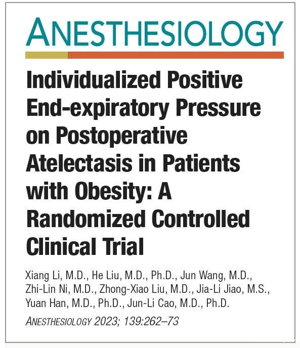 近日,在最新一期《Anesthesiology》杂志(医学期刊1区,Top期刊,自然指数期刊)发表了伟德客户端下载安装手机版附属医院麻醉科/江苏省麻醉学重点实验室/江苏省麻醉与镇痛应用科技重点实验室曹君利教授课题组的最新临床研究成果“Individualized Positive End-expiratory Pressure on Postoperative Atelectasis in Patients with Obesity: A Randomized Controlled Clinical Trial”。麻醉学院2018级专业型硕士研究生李想和浙江大学附属湖州中心医院麻醉科刘鹤教授为共同第一作者,复旦大学附属眼耳鼻喉科医院韩园教授全程参与指导了该研究,并作出重要贡献。该文被选为当期重点推荐(featured article)和封面文章,同期配发长文述评。