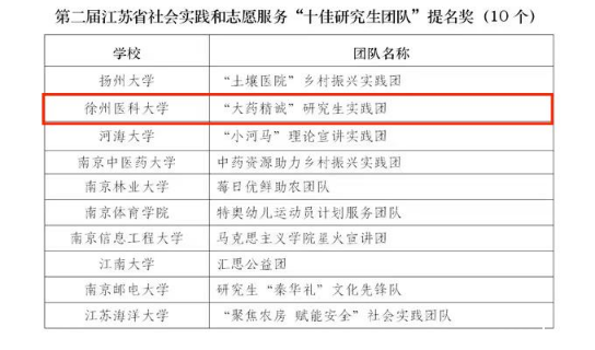 近日,江苏省学位与研究生教育学会、江苏省教育厅教育宣传中心等部门联合发文,公布第二届江苏省社会实践和志愿服务“十佳研究生”“十佳研究生团队”推选结果。药学院“大药精诚”研究生实践团荣获江苏省“十佳研究生团队”提名奖。