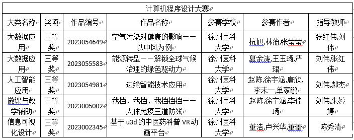 近日,2023 年(第 16 届)中国大学生计算机设计大赛评审结果公示,我校医学信息与工程学院刘伟、张红伟、陈秀清、朱婷婷、郝杰组成的教师团队指导医学信息工程、计算机科学与技术、智能医学、物联网工程专业学生,在人工智能应用、大数据应用、微课与教学辅助、信息可视化设计4个赛道获得国赛三等奖5项,国奖数量实现突破。