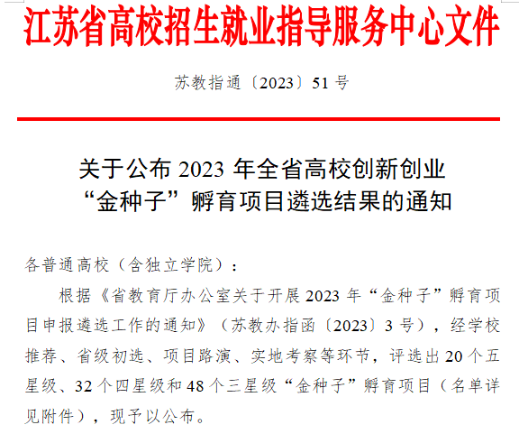 全省106所高校申报“金种子”孵育项目共计949项,主要分为科技研发、文化创意、现代服务三大类。经学校推荐、省级初选、项目路演、实地考察等环节,评选出20个五星级、32个四星级和48个三星级“金种子”孵育项目。