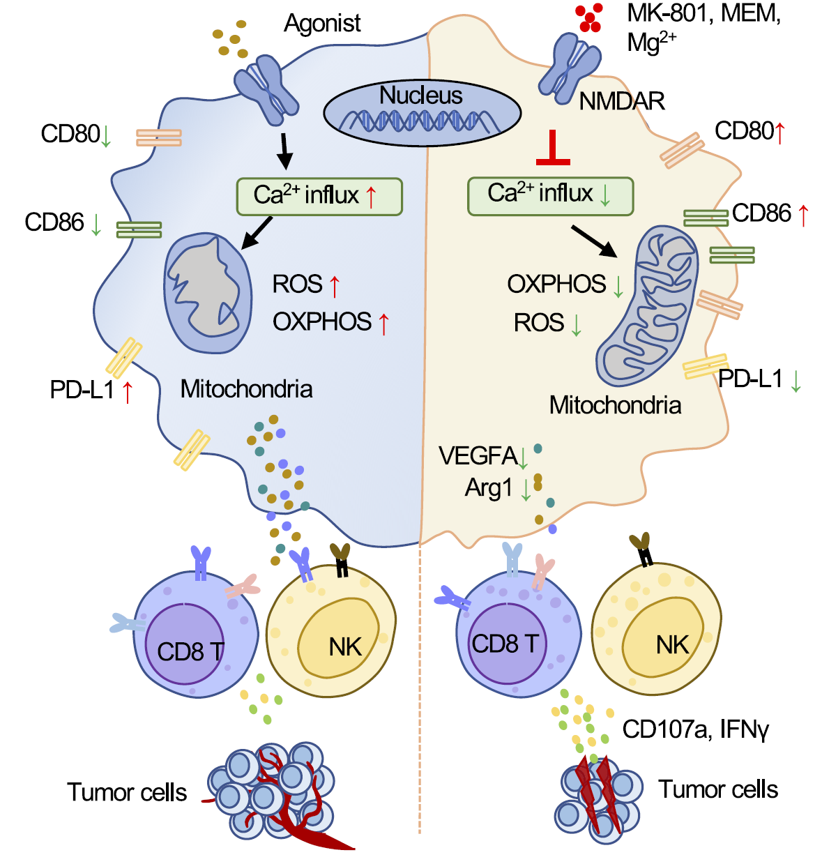 NMDAR是由四个亚基组成的钙离子通道。在TME中,NMDAR在巨噬细胞中的表达被上调,NMDAR被激活后引发钙离子流入,下游CAMKII/ERK/CREB通路被激活;巨噬细胞氧化磷酸化代谢增强、ROS水平上升、线粒体结构被破坏,导致肿瘤相关巨噬细胞(TAMs)的免疫抑制功能增强。NMDAR拮抗剂能有效解除TAMs细胞介导的免疫抑制,促进T细胞和自然杀伤(NK)细胞介导的抗肿瘤免疫应答。NMDAR拮抗剂美金刚、酒石酸艾芬地尔等临床药物显著抑制肿瘤的发展,同时,NMDAR拮抗剂与抗PD-1抗体联合治疗能够显著提高免疫检测点阻断抗体的疗效。该研究为治疗神经相关疾病临床药物用于肿瘤免疫治疗提供了理论依据,具有重要的临床意义。