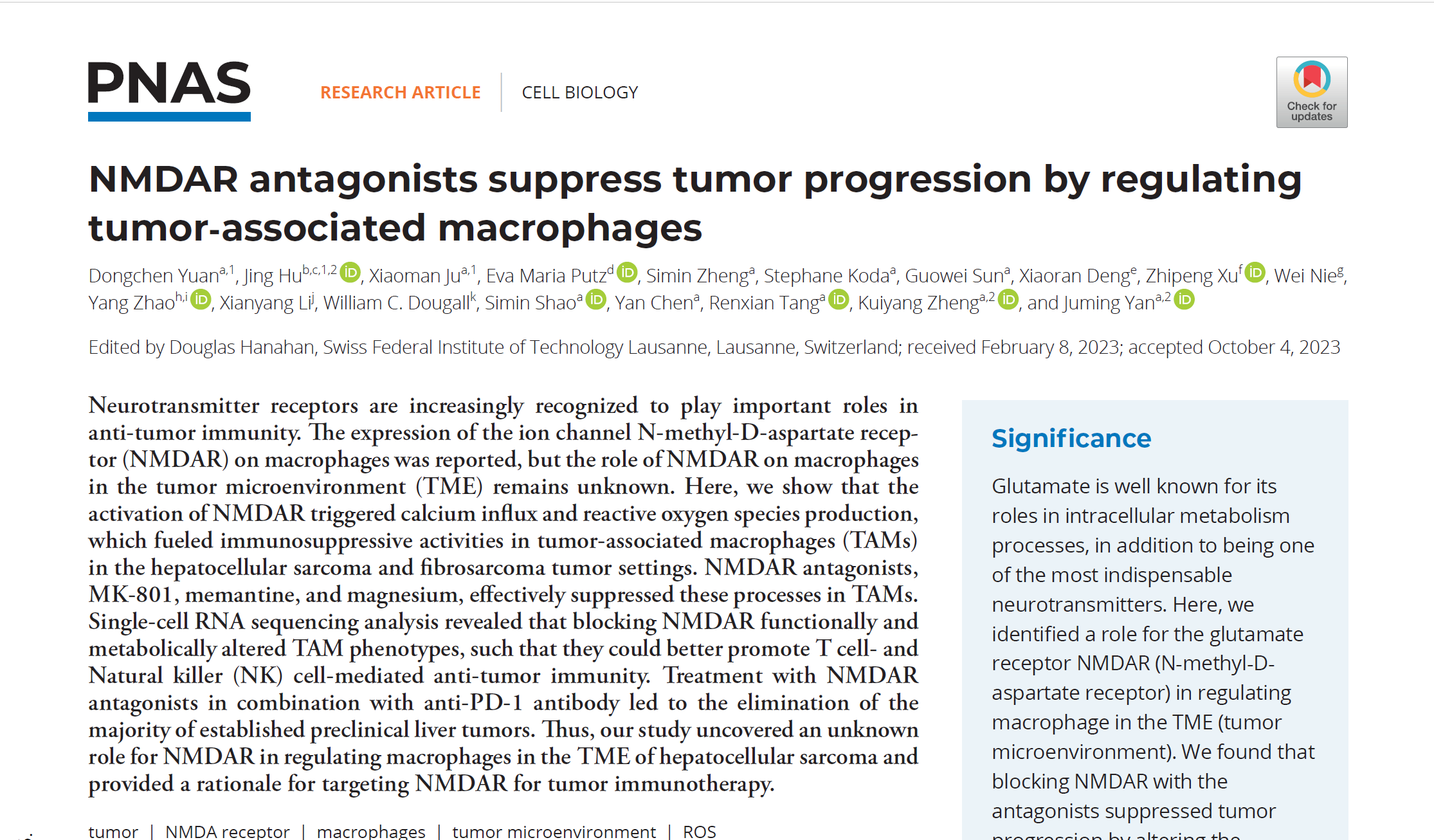 近日,江苏省免疫与代谢重点实验室闫居明教授团队以伟德客户端下载安装手机版为第一完成单位,在国际权威杂志美国科学院院刊Proceedings of the National Academy of Sciences of the United States of America (PNAS, IF:12.779) 在线发表题为“NMDAR antagonists suppress tumor progression by regulating tumor-associated macrophages”的最新研究成果。该论文通讯作者为我校闫居明教授、郑葵阳教授和胡静副教授,该团队2022级博士研究生袁东晨、胡静副教授和居晓曼博士后为共同第一作者。PNAS主编Douglas Hanahan教授是本研究论文的审稿人,对本研究的创新性和研究价值均给予了充分肯定。该论文受到国家自然科学基金、江苏省自然科学基金、伟德客户端下载安装手机版“揭榜挂帅”项目、伟德客户端下载安装手机版校青年创新团队项目等资助。