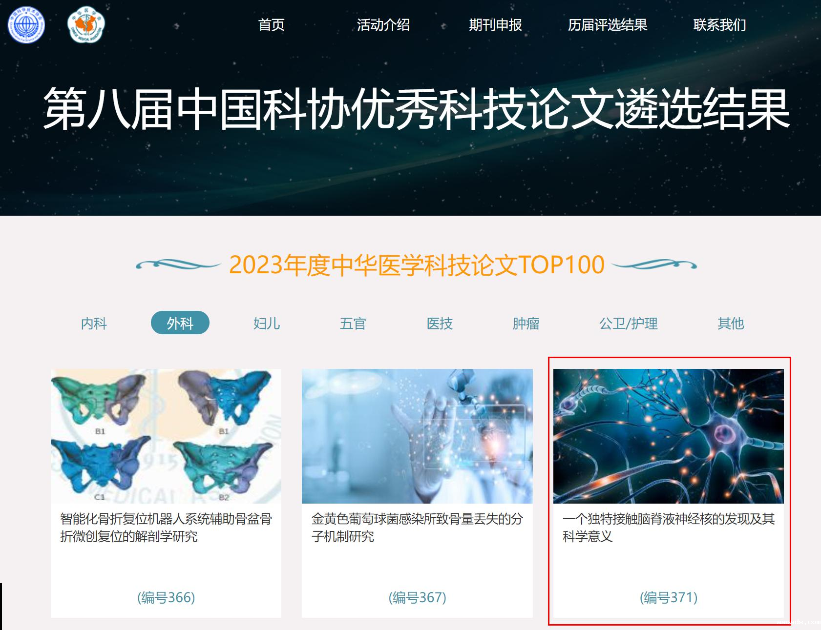 在第八届中国科协优秀科技论文评选中,我校麻醉学院张励才教授发表于《国际麻醉学与复苏杂志》2022年第43卷第2期的论文《一个独特接触脑脊液神经核的发现及其科学意义》入选2023年度中华医学科技论文TOP100。