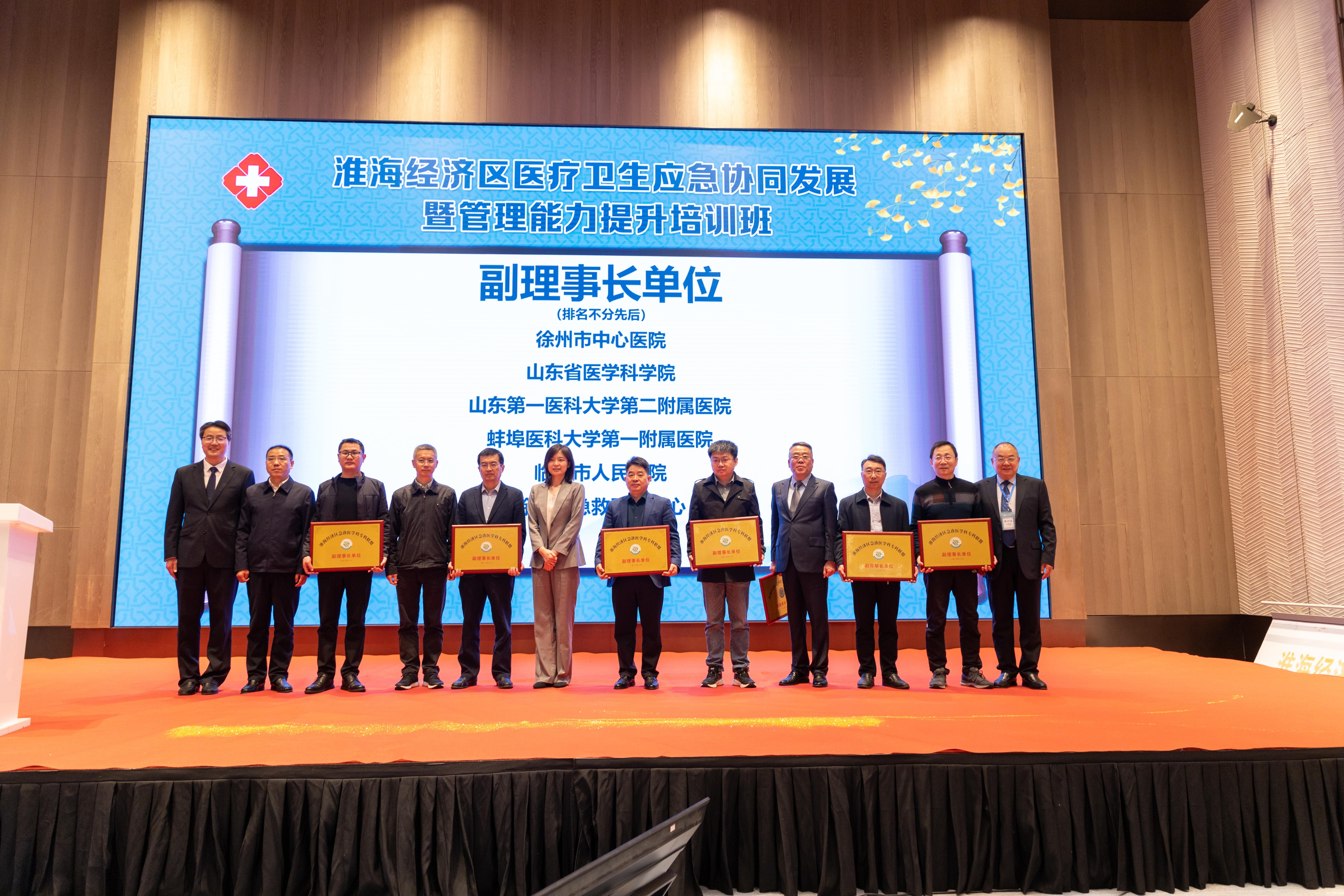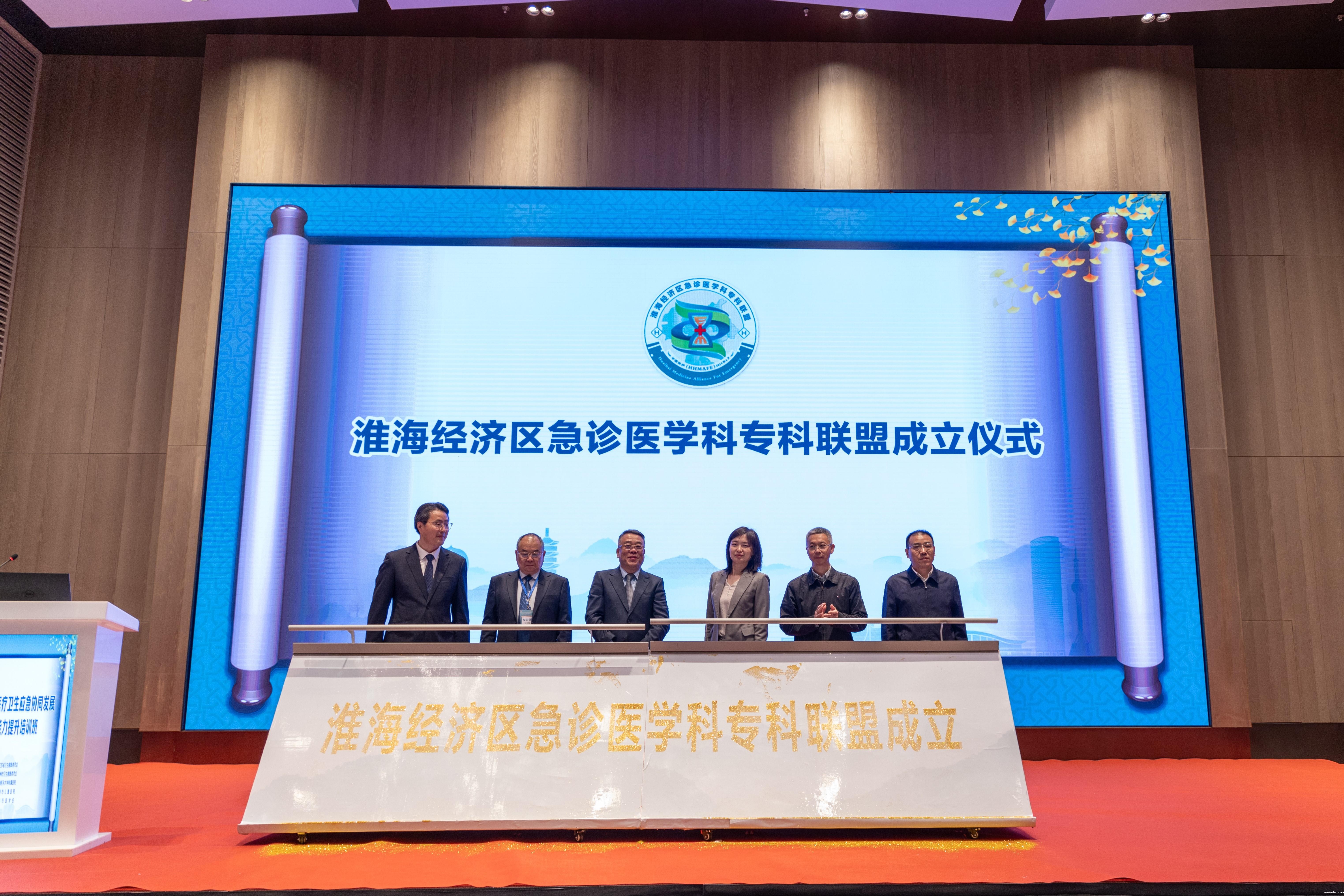 国家卫健委医疗应急司医疗应急指导处处长刘文、邱晓辉、曹永、中华医学会急诊医学分会主任委员吕传柱、江苏省卫生应急研究所所长许铁共同为“淮海经济区急诊医学科专科联盟”揭牌,并为14家联盟理事长、副理事长单位进行授牌。