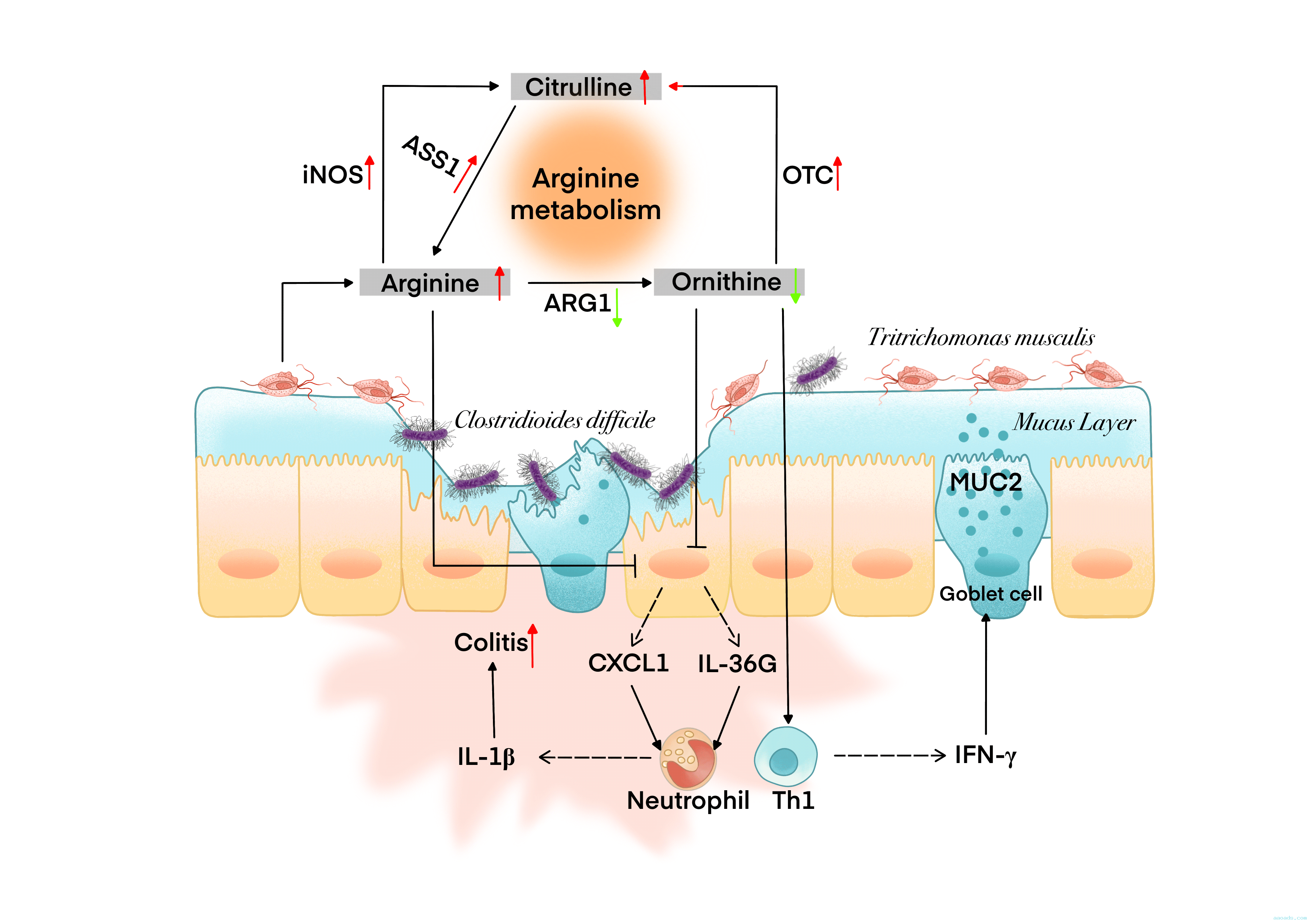 肠道微生态失调是艰难梭菌感染的重要因素,但肠道真核微生物在其中有何作用尚不清楚。研究人员研究共生原生生物、艰难梭菌、宿主免疫三方互作,研究发现共生原生生物能够调控宿主免疫反应和肠道稳态缓解艰难梭菌感染。进一步的研究表明,共生原生生物T.mu通过调节宿主精氨酸-鸟氨酸代谢轴影响肠道免疫细胞分化,以减轻对艰难梭菌的易感性。该工作为艰难梭菌感染防治研究打开新的思路。