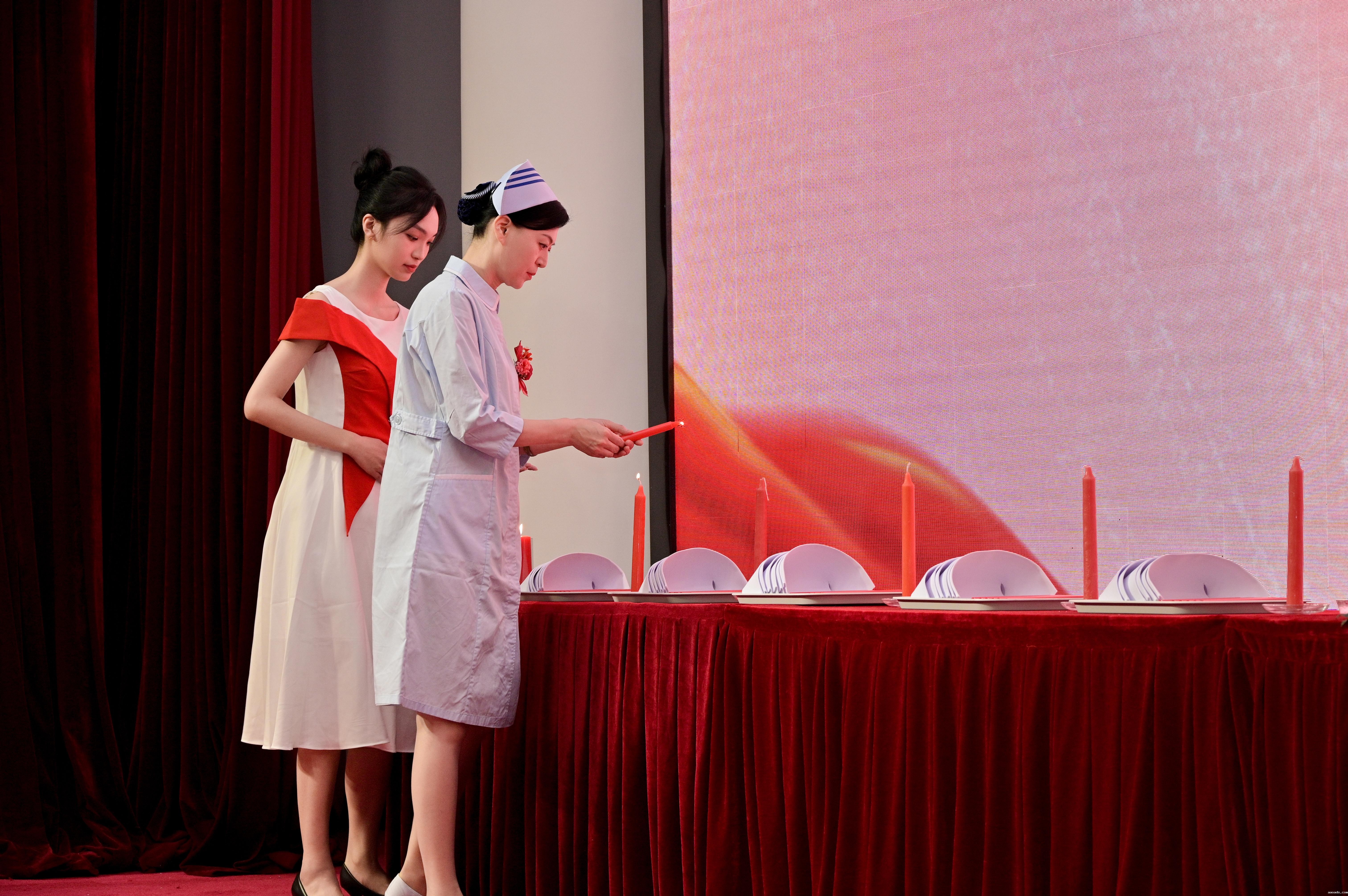燕尾为冠,使命接力,周芳讲述了“提灯女神”南丁格尔的光辉事迹,带领师生重温南丁格尔“甘于奉献、护佑生命”的伟大精神,希望同学们能够以实际行动追寻南丁格尔的脚步,心怀国之大者,不忘初心。夏静、刘玉平共同点燃红烛,烛光闪耀,乐声回旋,伴随着舒缓的旋律与提灯女神的指引,2021级护生代表迈着庄严而坚毅的步伐依次走上舞台,护理前辈们为他们戴上圣洁的燕帽,传递象征南丁格尔手中明灯的蜡烛,在烛影摇曳中坚定信仰之路。