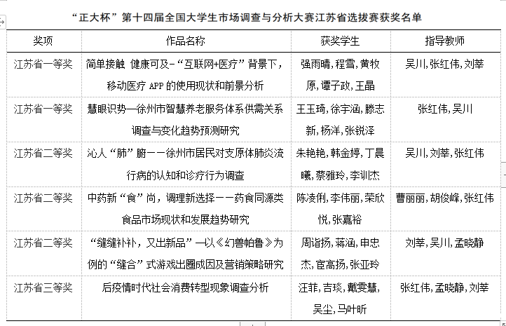 自去年11月起,指导老师通过精心策划培训方案、系列讲座、模拟演练、邀请专家指导等方式,有效提升学生的市场调研、数据分析能力,锻炼了学生的团队协作和创新实践能力。经过校内答辩会评,我校共有6支队伍进入省赛并获奖。