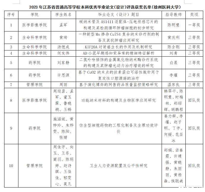 近日,江苏省教育厅公布了2023年度江苏省普通高等学校优秀本专科毕业论文(设计)评选结果。我校共有10个项目获奖,其中一等奖1项,三等奖6项,团队奖3项,获奖层次及数量均创历史新高。