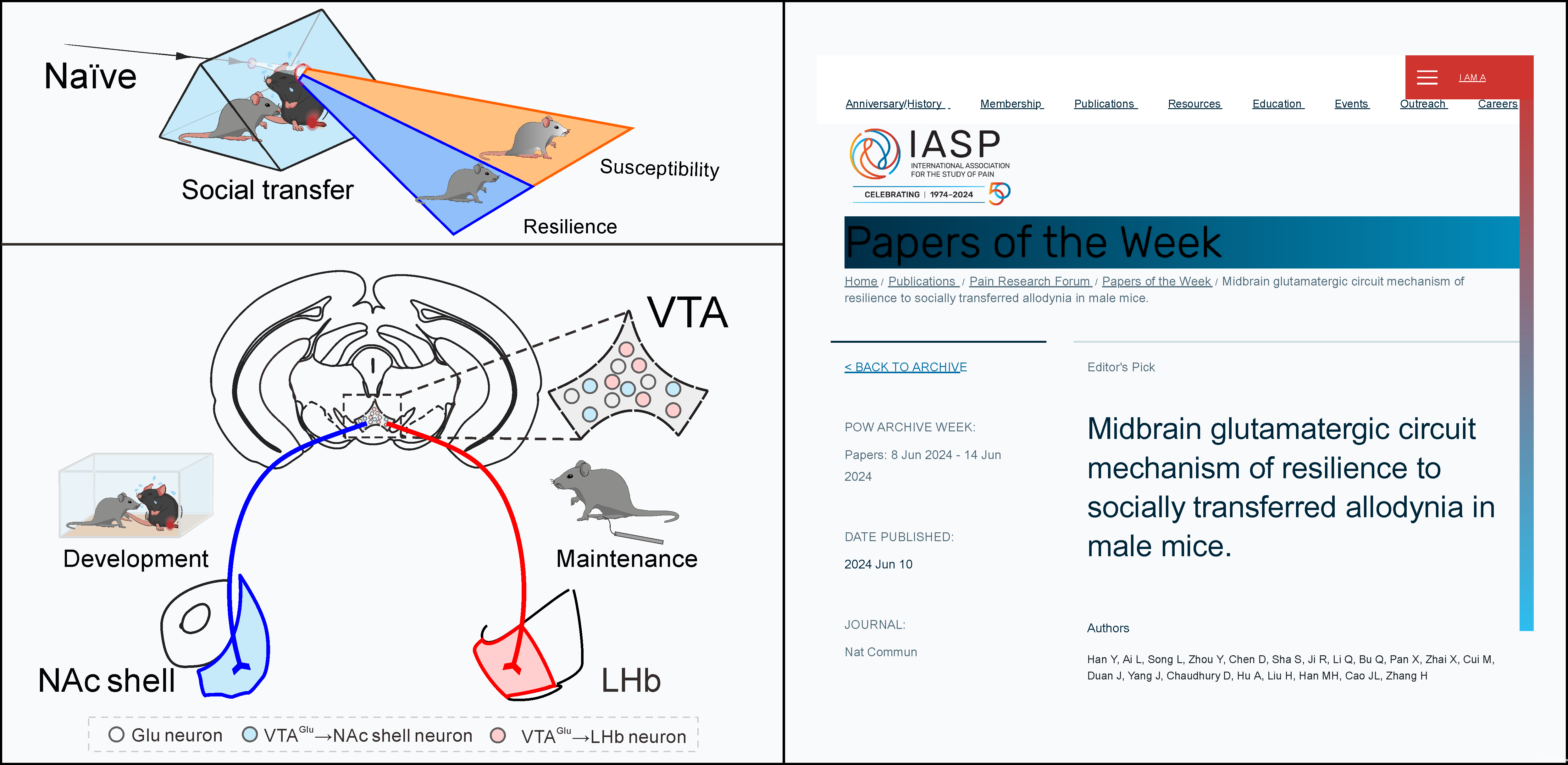 6月10日,我校江苏省麻醉学重点实验室张红星、曹君利教授团队与深圳理工大学韩明虎教授合作,在疼痛非易感的脑机制研究方面获得新进展,研究成果“Midbrain glutamatergic circuit mechanism of resilience to socially transferred allodynia in male mice”发表在Nature Communications杂志(自然指数期刊,综合性期刊1区,Top期刊)。文章发表当天即被国际疼痛研究学会(IASP)遴选为本周推荐文章。