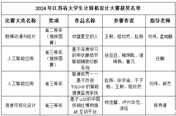 “新大陆杯”2024年江苏省大学生计算机设计大赛暨2024年中国大学生计算机设计大赛江苏省级赛决赛近日在江苏海洋大学落下帷幕,我校4件作品分别斩获省赛二等奖1项、三等奖3项,其中2件作品将在8月参加国赛角逐。