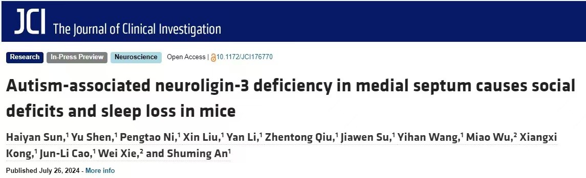 7月26日江苏省麻醉学重点实验室/江苏省麻醉与镇痛应用技术重点实验室安述明、曹君利教授与东南大学谢维教授团队合作在Journal of Clinical Investigation(医学期刊1区,Top 期刊,自然指数期刊)杂志上发表文章《Autism-associated neuroligin-3 deficiency in medial septum causes social deficits and sleep loss in mice》,揭示内侧隔核自闭症相关基因NLG3敲除导致社交记忆损伤和睡眠障碍。在该研究中,麻醉学重点实验室孙海艳副教授和硕士毕业生申宇为共同第一作者,麻醉学重点实验室安述明、曹君利教授与东南大学谢维教授为共同通讯作者。麻醉衔接班本科生倪鹏涛,研究生刘鑫、李燕、邱帧童、苏佳文、王一涵、孔祥熙也作出了重要贡献。