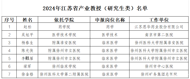 近日,省教育厅公布了2024年江苏省研究生导师类产业教授(兼职)选聘结果,共200人入选。我校推荐的赵松等7人成功获批为江苏省研究生类产业教授。同时,省教育厅、科技厅公布了2024年江苏省研究生工作站名单,我校有2个研究生工作站获批,到目前为止我校已有14个研究生工作站获批江苏省研究生工作站。