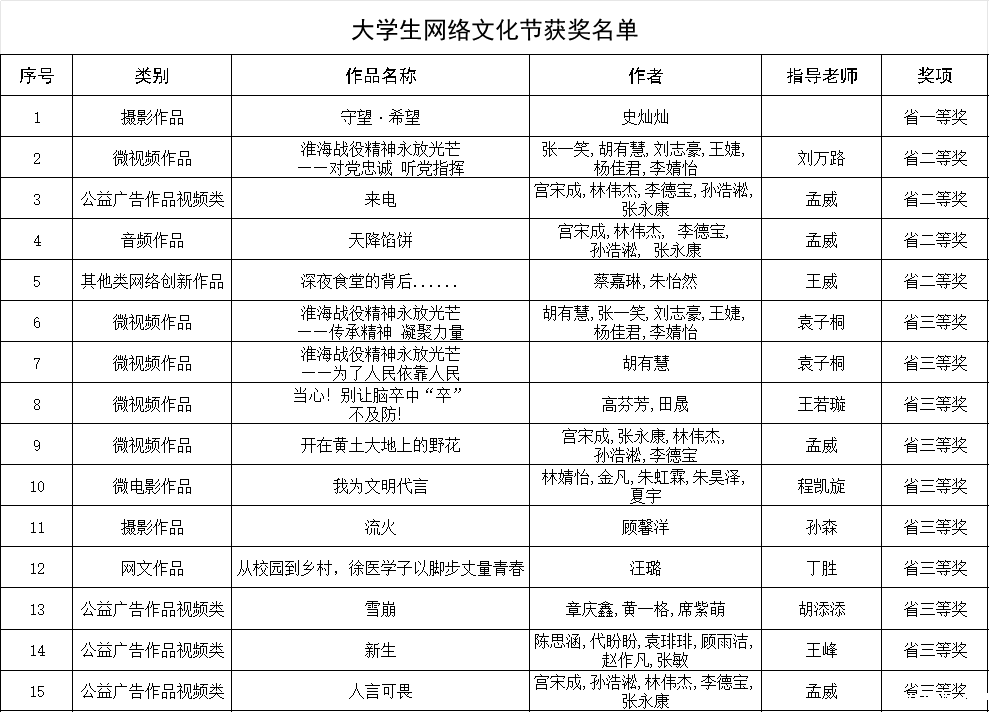 近日,第七届全国大学生网络文化节和全国高校网络教育优秀作品推选展示活动,经作品征集、资格审核、专家遴选、作品政审、结果公示等程序,公布入选名单。我校共获得省级大学生网络文化节一等奖1项、二等奖4项、三等奖10项,省级高校网络教育优秀作品一等奖1项、三等奖4项。